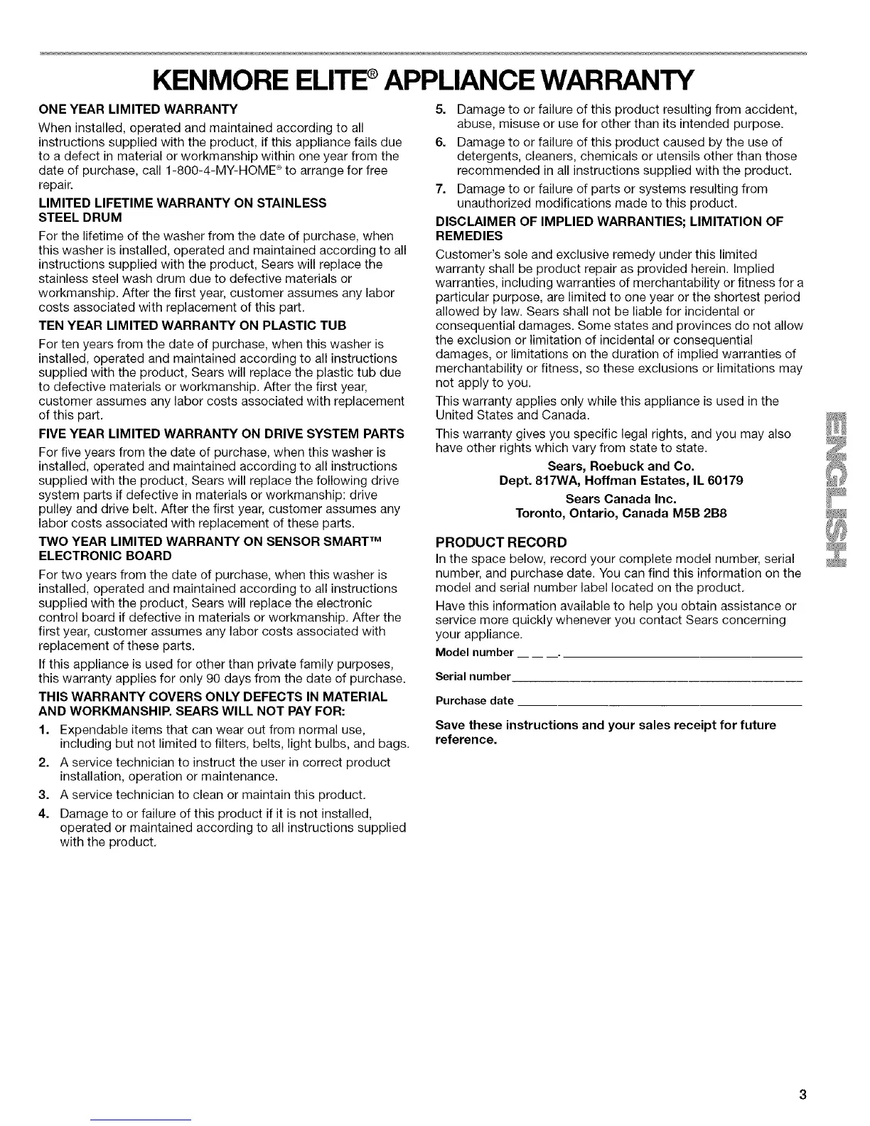 Kenmore Elite HE3 110.4789 Series - Kenmore Elite Appliance Warranty; One Year Limited Warranty; Limited Lifetime Warranty on Stainless Steel Drum; Ten Year Limited Warranty on Plastic Tub
