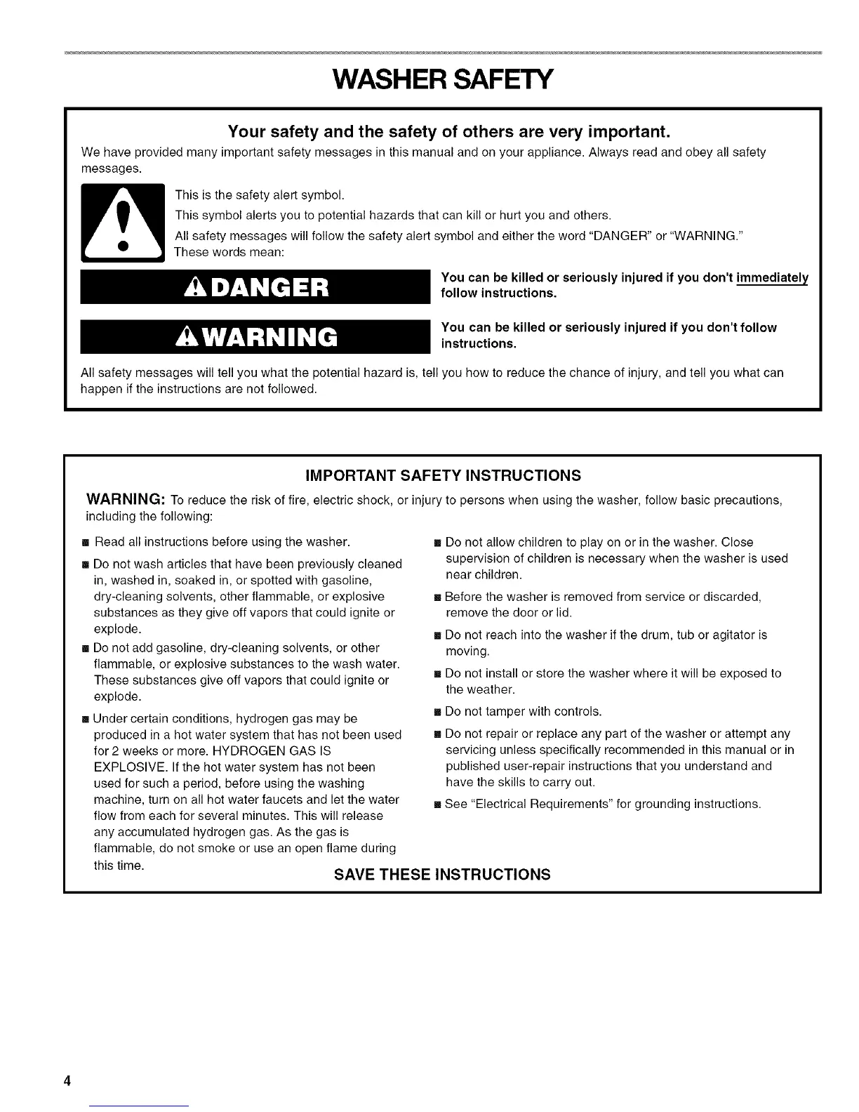 Kenmore Elite HE3 110.4789 Series - Washer Safety; Important Safety Instructions