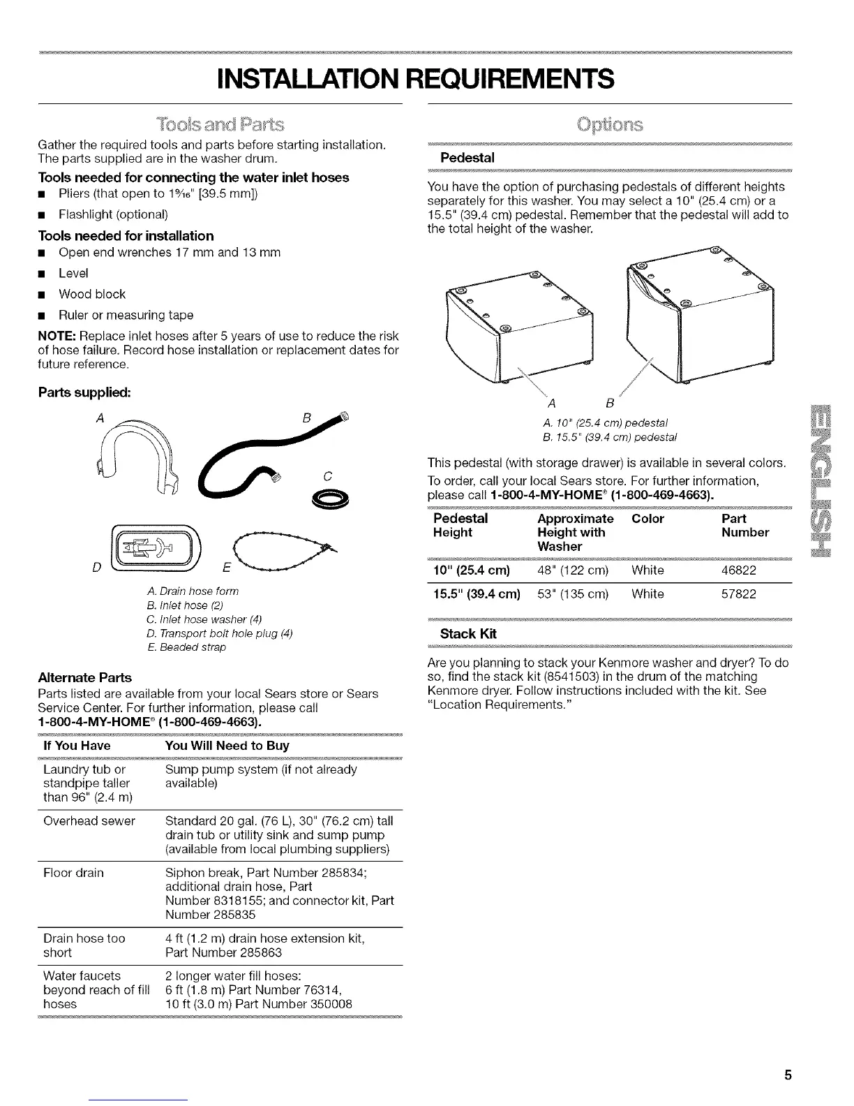 Kenmore Elite HE3 110.4789 Series - Installation Requirements; Tools and Parts