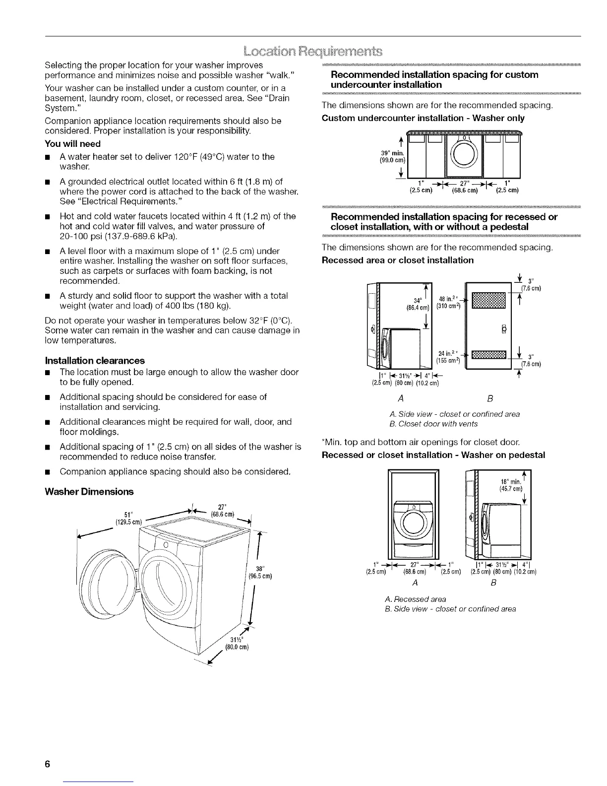 Kenmore Elite HE3 110.4789 Series - Location Requirements; Recommended Installation Spacing for Custom Undercounter Installation; Recommended Installation Spacing for Recessed or Closet Installation, with or without a Pedestal