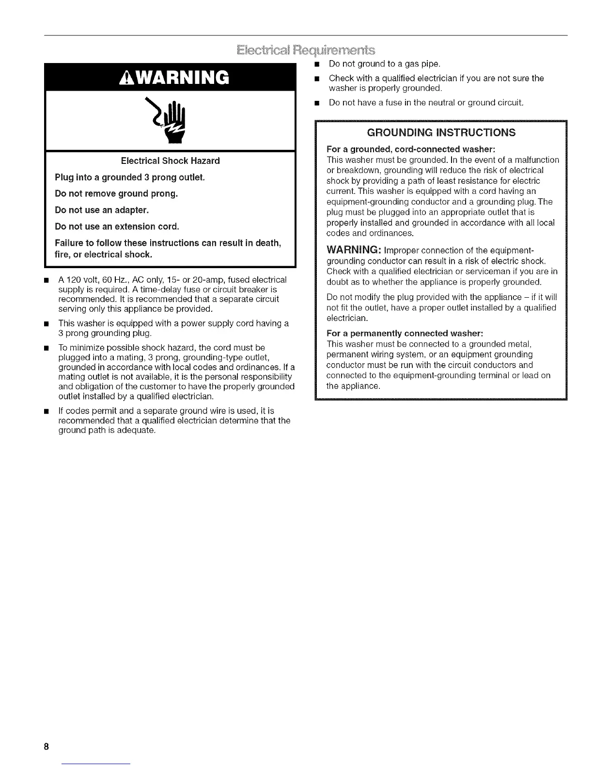 Kenmore Elite HE3 110.4789 Series - Electrical Requirements; Grounding Instructions