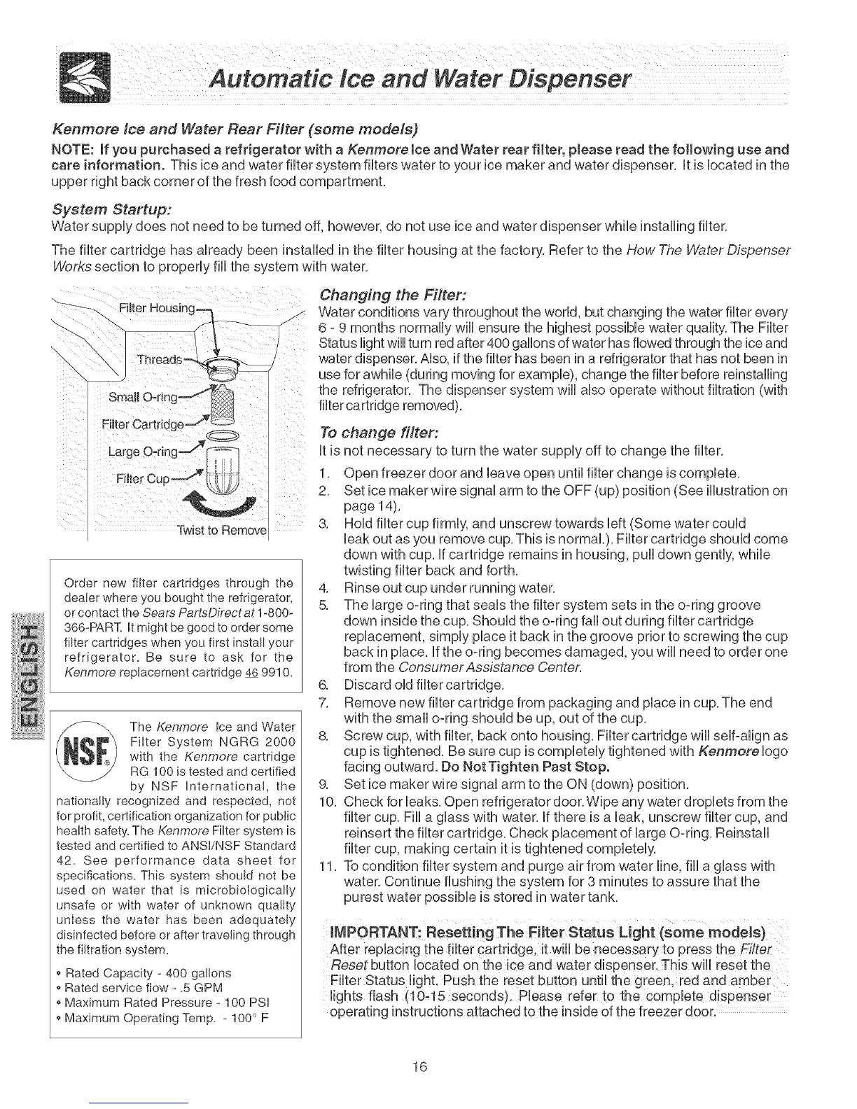 NOTE: [f you purchased a refrigerator with a Kenmore Ice and Water rear filter, please read the for[owing use and
