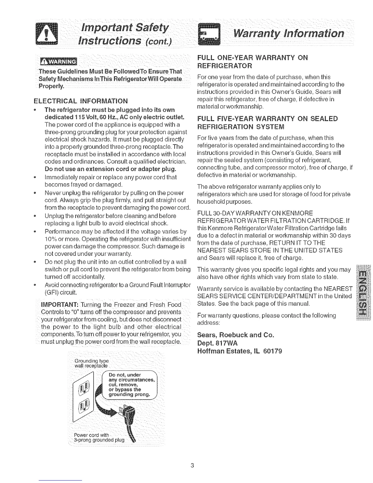 instructions provided in this Owner's Guide, Sears wiii