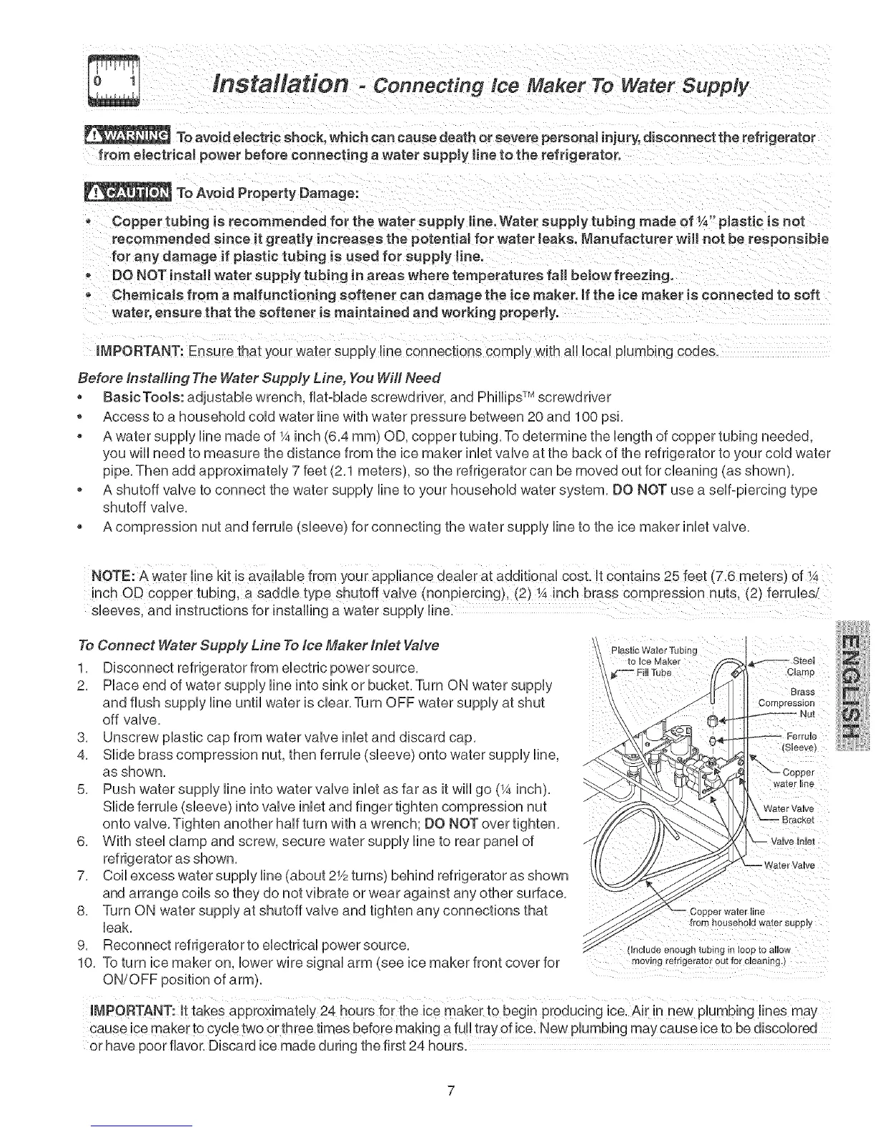 o Copper tubing is recommended for the water suppJy Jine.Water supply tubing made of ¼"" plastic is not