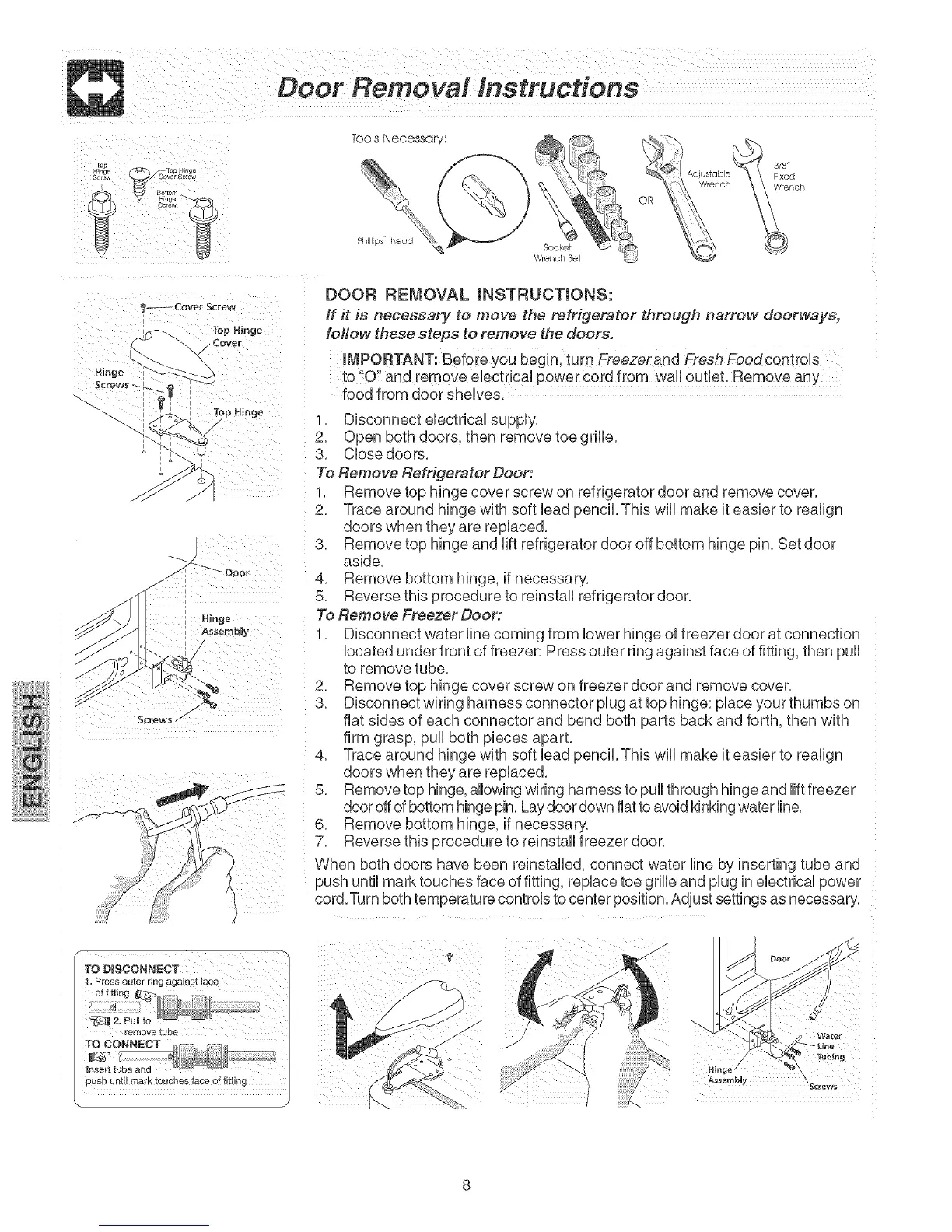 door off of bottom hinge pin.Lay door down fiat to avoidkinking water line.