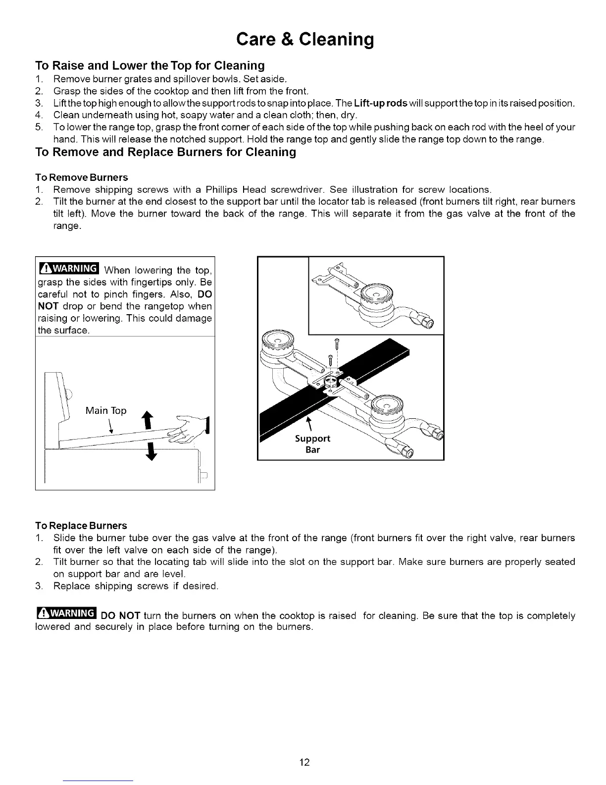 DO NOT turn the burners on when the cooktop is raised for cleaning. Be sure that the top is completely