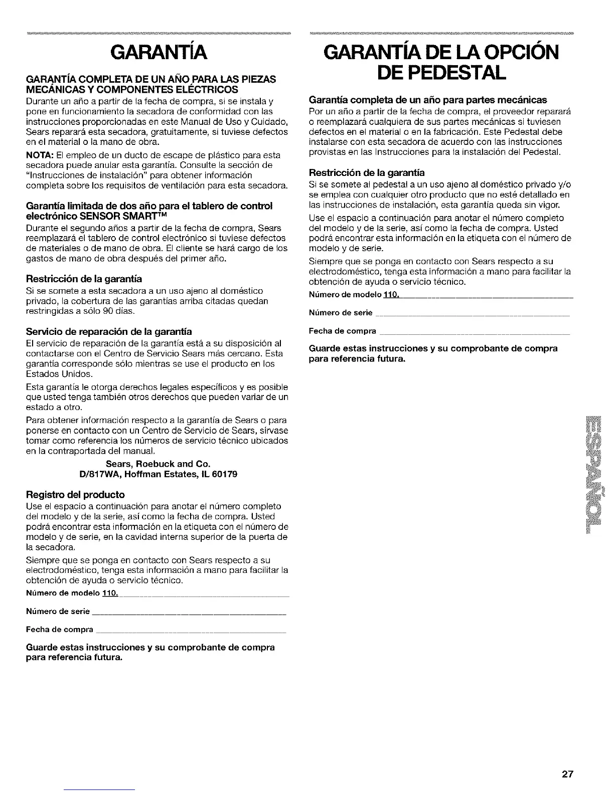 Para obtener informaci6n respecto a la garantia de Sears o para