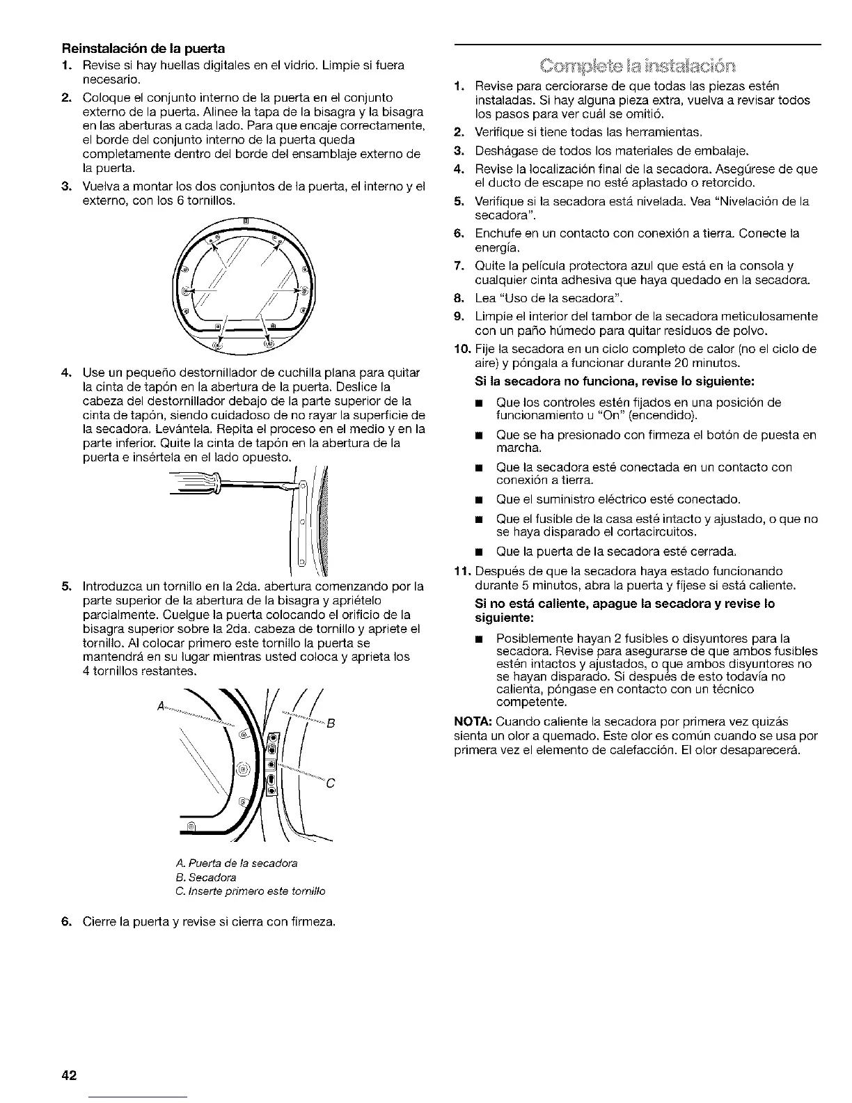 5. Verifique si la secadora estb. nivelada. Vea "Nivelaci6n de la