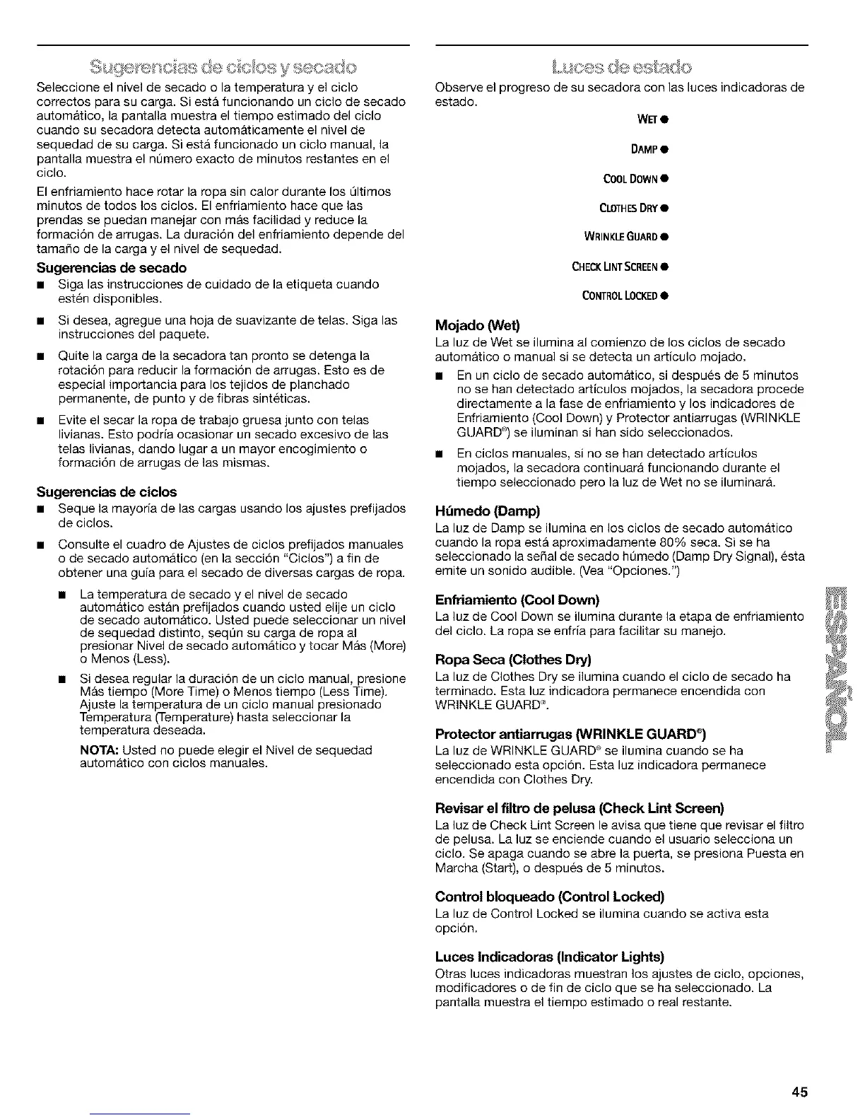 Observe el progreso de su secadora con las luces indicadoras de