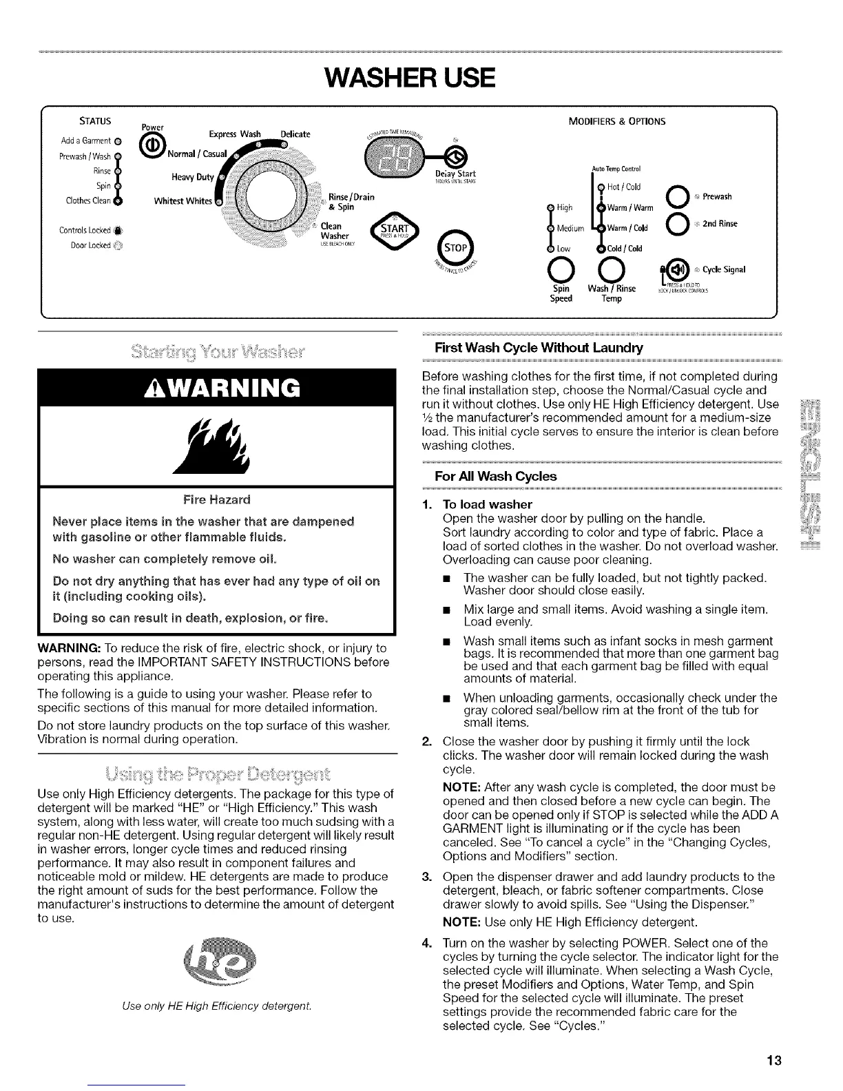 NOTE: Use only HE High Efficiency detergent.