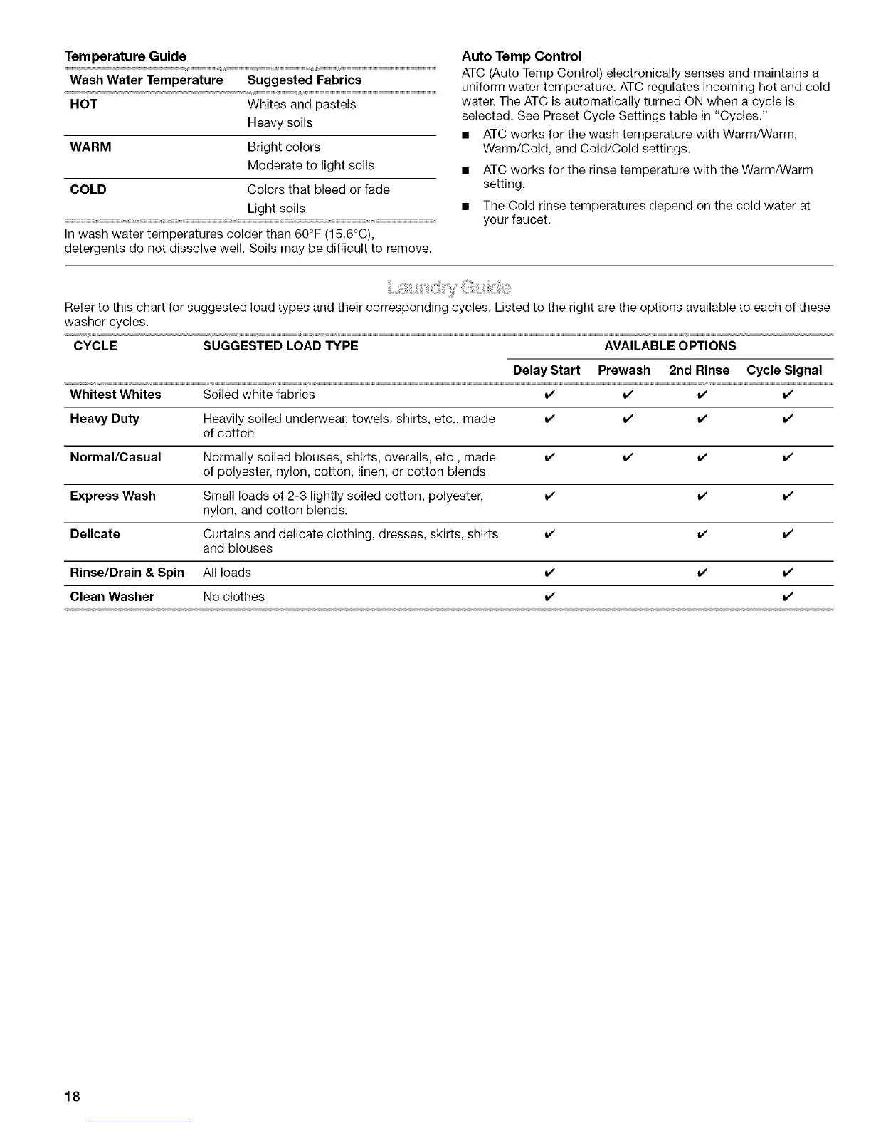 Refer to this chart for suggested load types and their corresponding cycles. Listed to the right are the options available to each of these