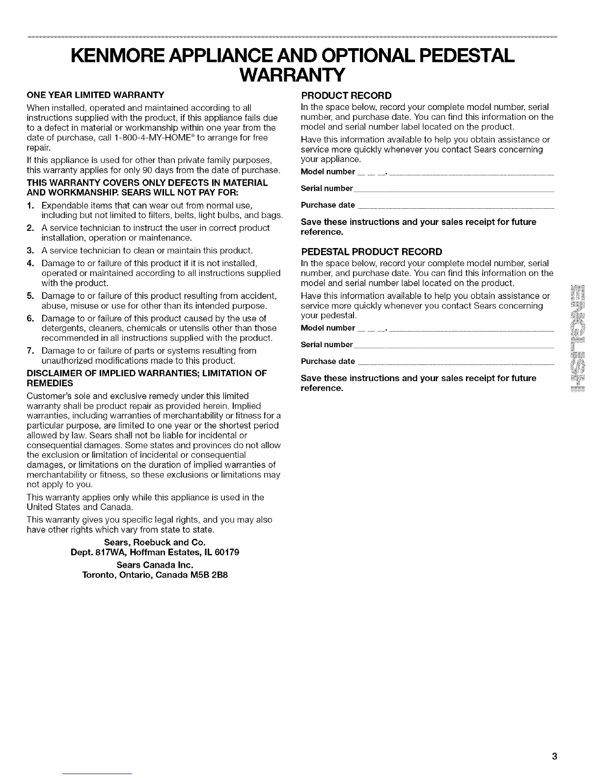 KENMORE APPLIANCE AND OPTIONAL PEDESTAL