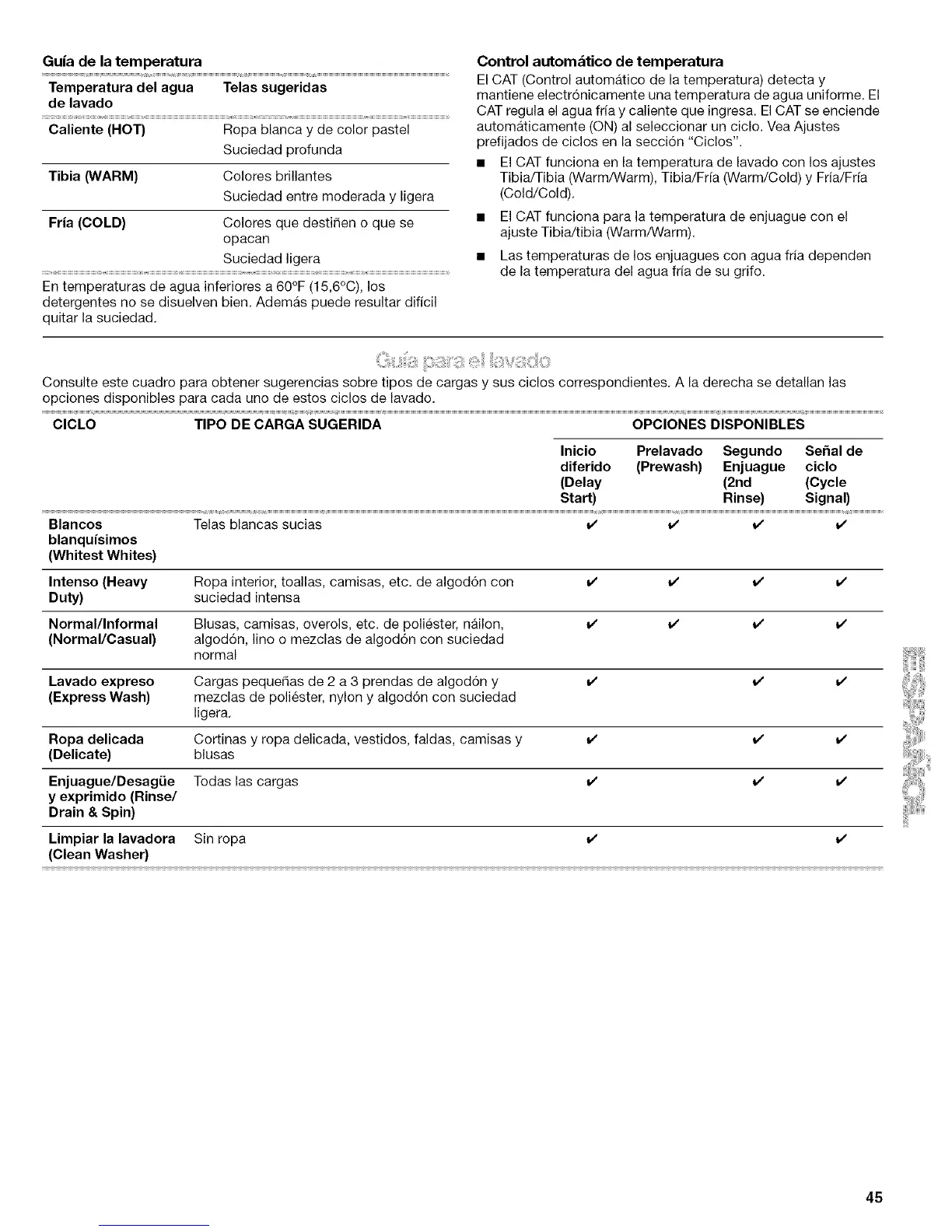 Consulte este cuadro para obtener sugerencias sobre tipos de cargas y sus ciclos correspondientes. A la derecha se detallan las