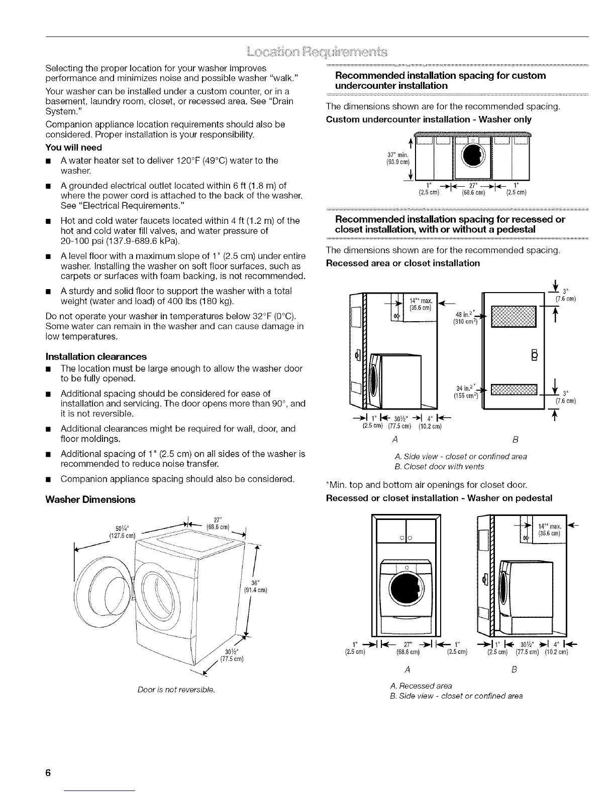 • Additional spacing of 1" (2.5 cm) on all sides of the washer is