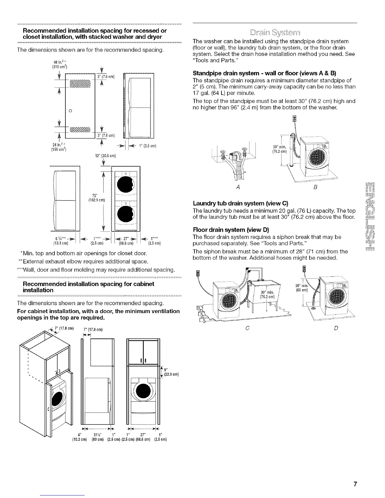 of the laundry tub must be at least 30" (76.2 cm) above the floor.