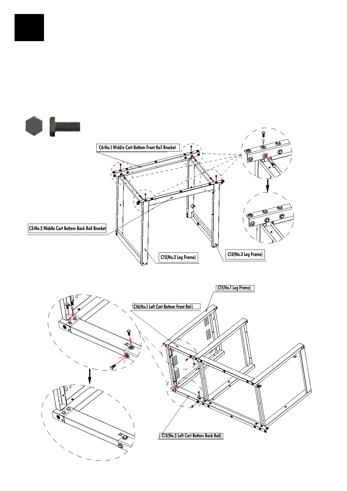 Use (8) M6X15 Hex Screws to attach C16(No. 1 Left Cart Bottom Front Rail) and C15(No.2 Left Cart Bottom