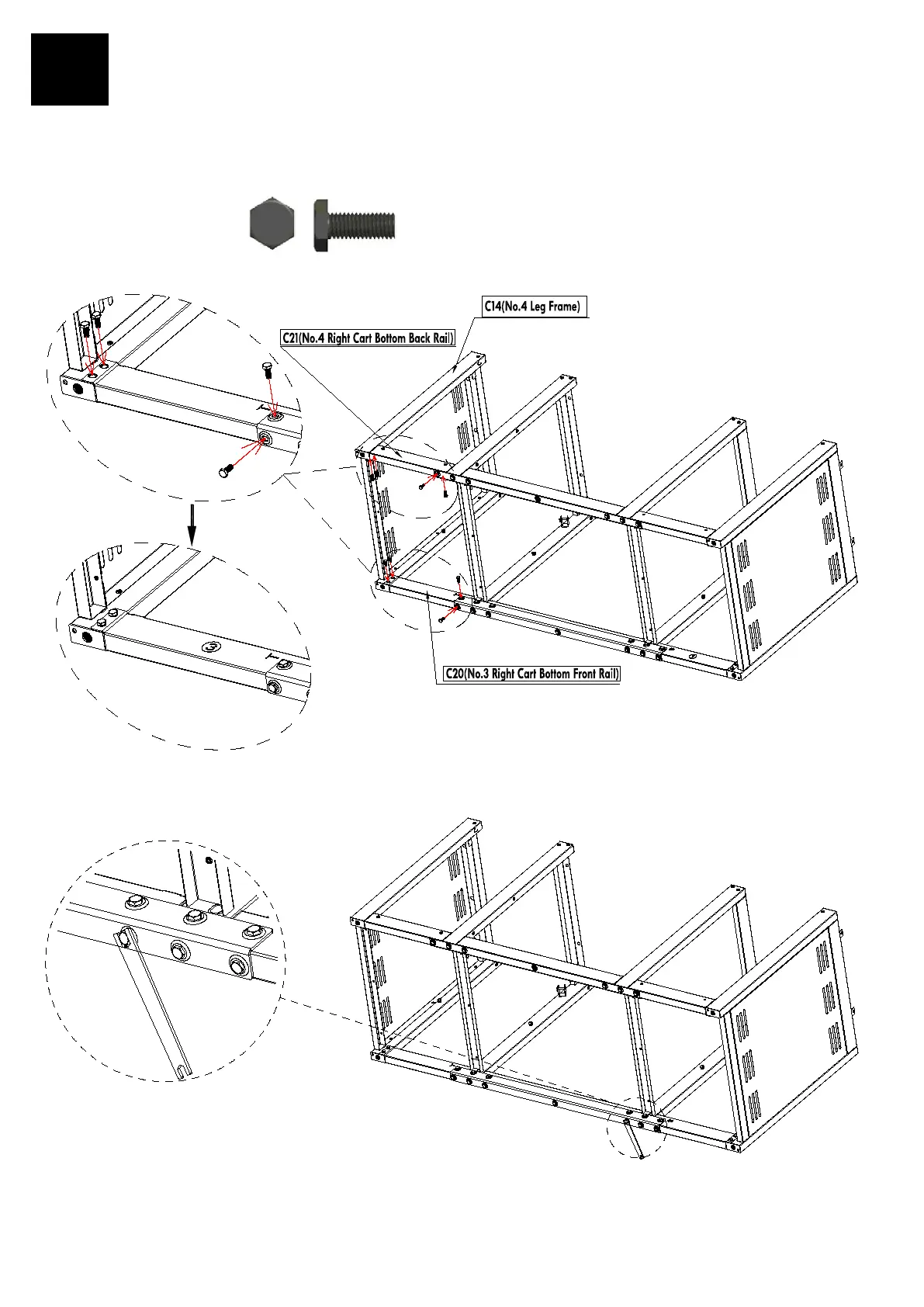 Use (8) M6x15 Hex Screws to attach C21(No.4 Right Cart Bottom Back Rail) and C20(No.3 Right Cart Bottom Front Rail) to
