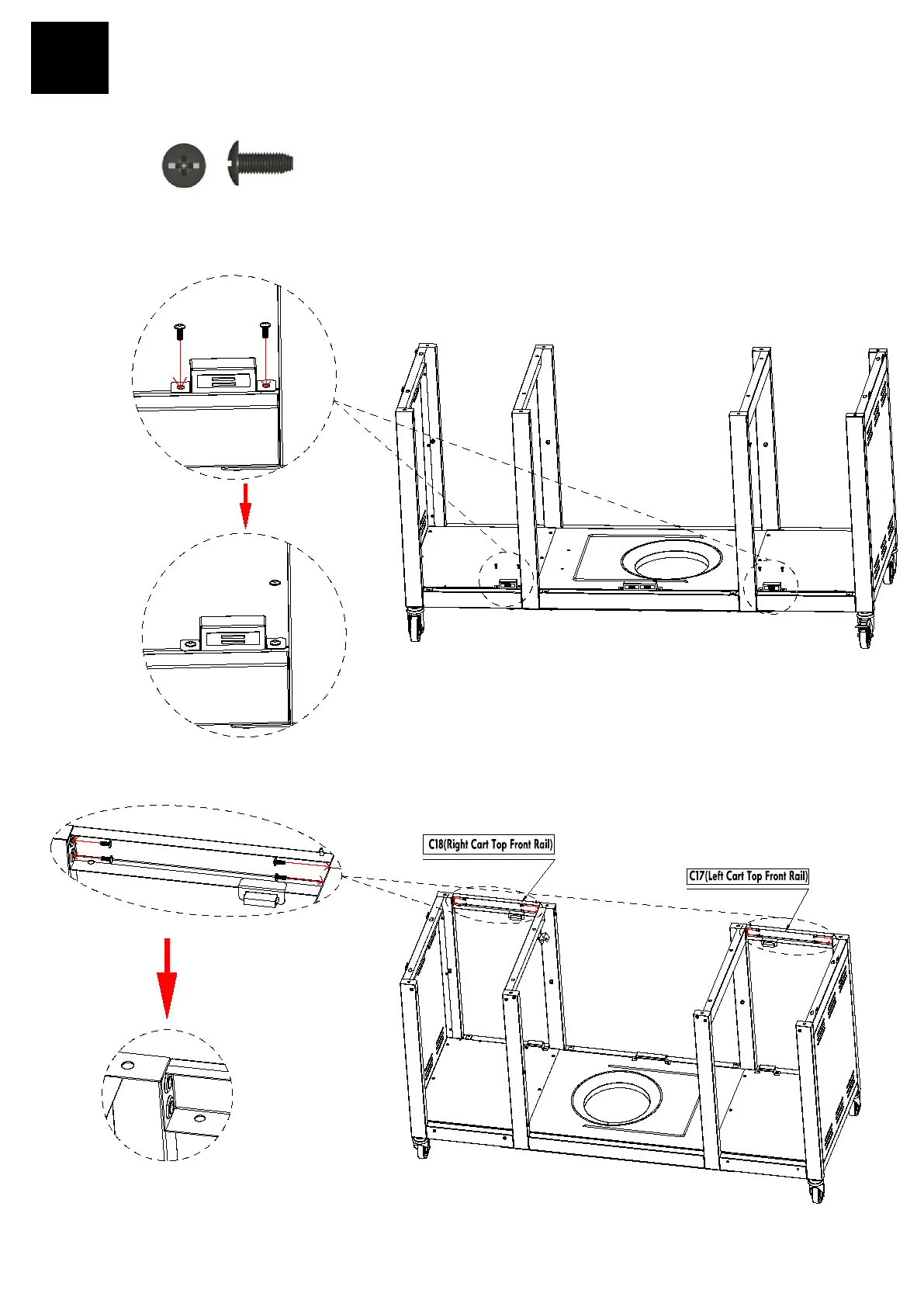 Used (4) M4x10 Screws to attach C17(Left Cart Top Front Rail) to the No.1 and No. 2 Leg Frames as shown.(B)