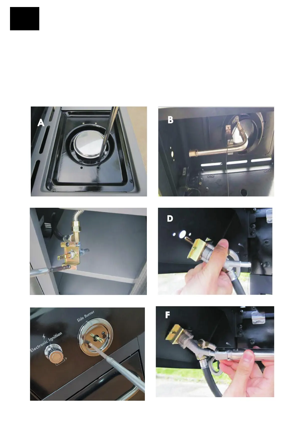 □ Remove the sid e burner grate. Loosen the burner in the side burner shelf (B). To loosen, unscrew and remove two front