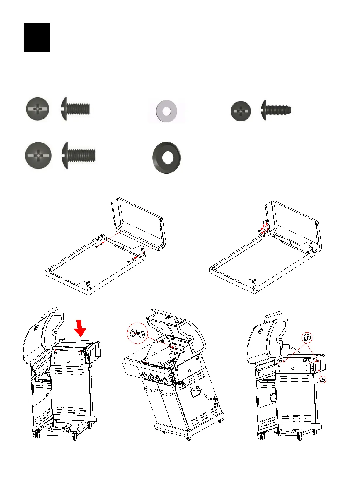 - From inside to outside of firebox with (2) M6x13 screws and M6 compression washers.(D) IMPORTANT: