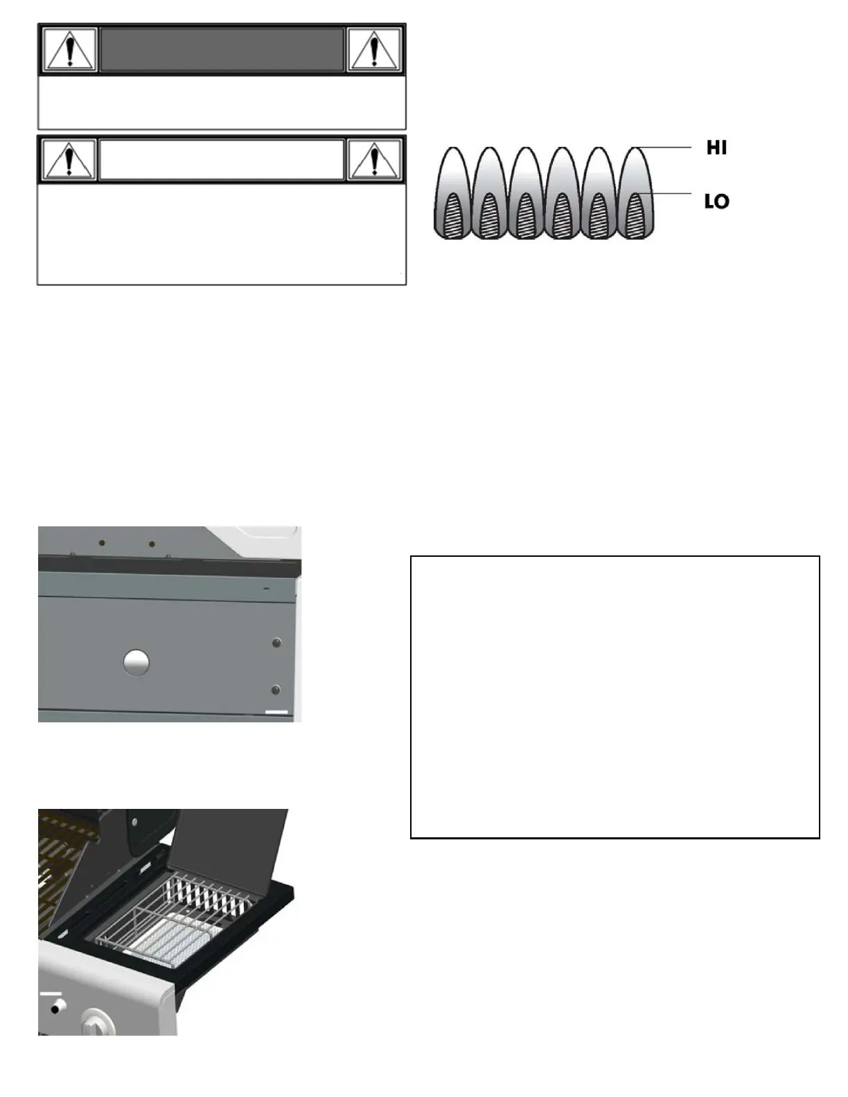 • Remove cooking grates and heat diffusers. Light burners, turn