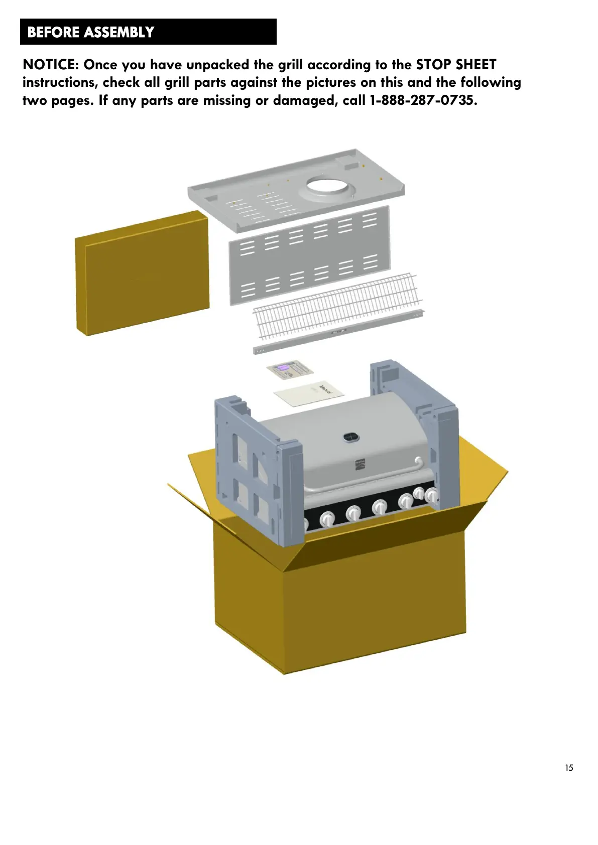 NOTICE: Once you have unpacked the grill according to the STOP SHEET