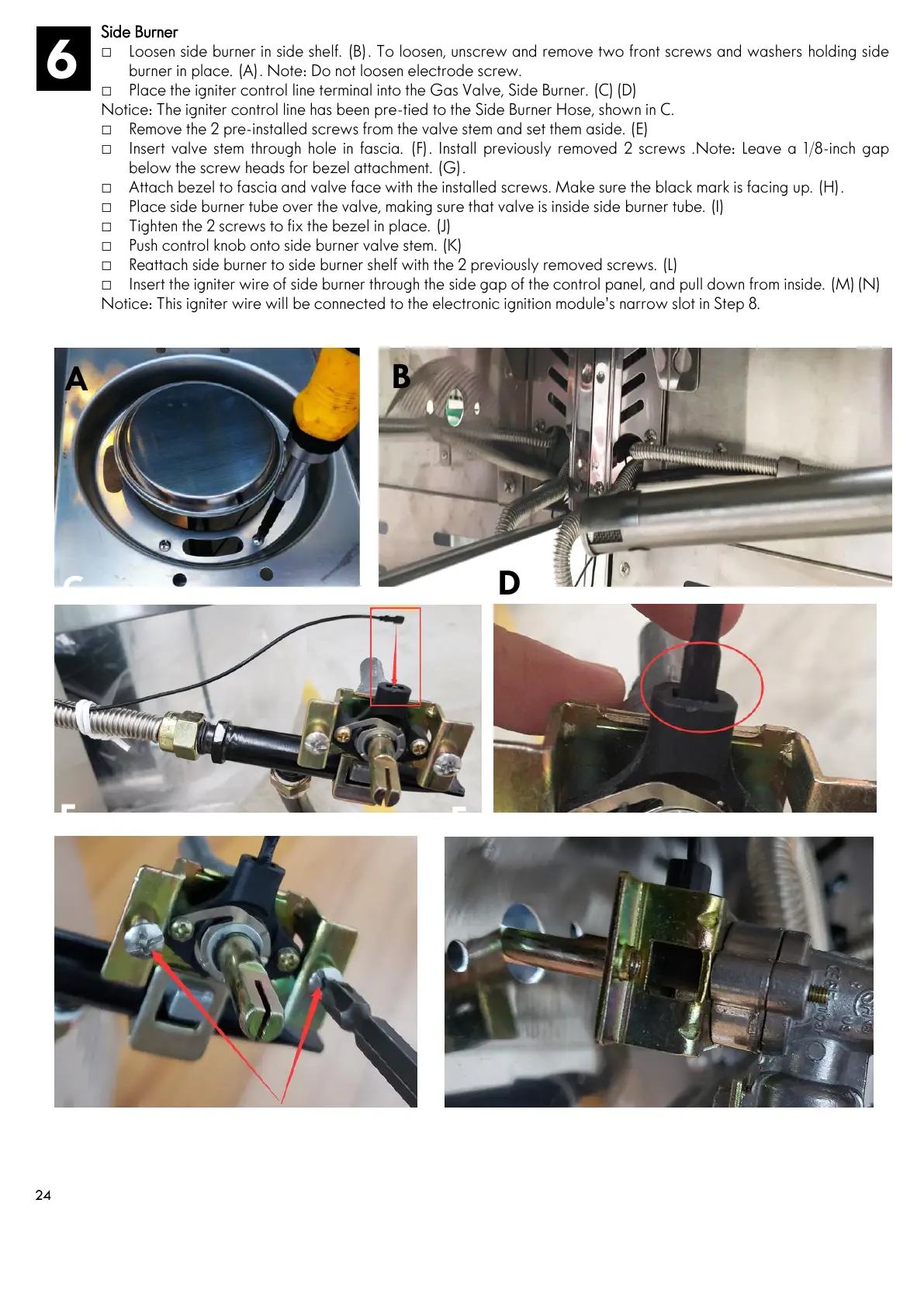 □ Place the igniter control line terminal into the Gas Valve, Side Burner. (C)(D)