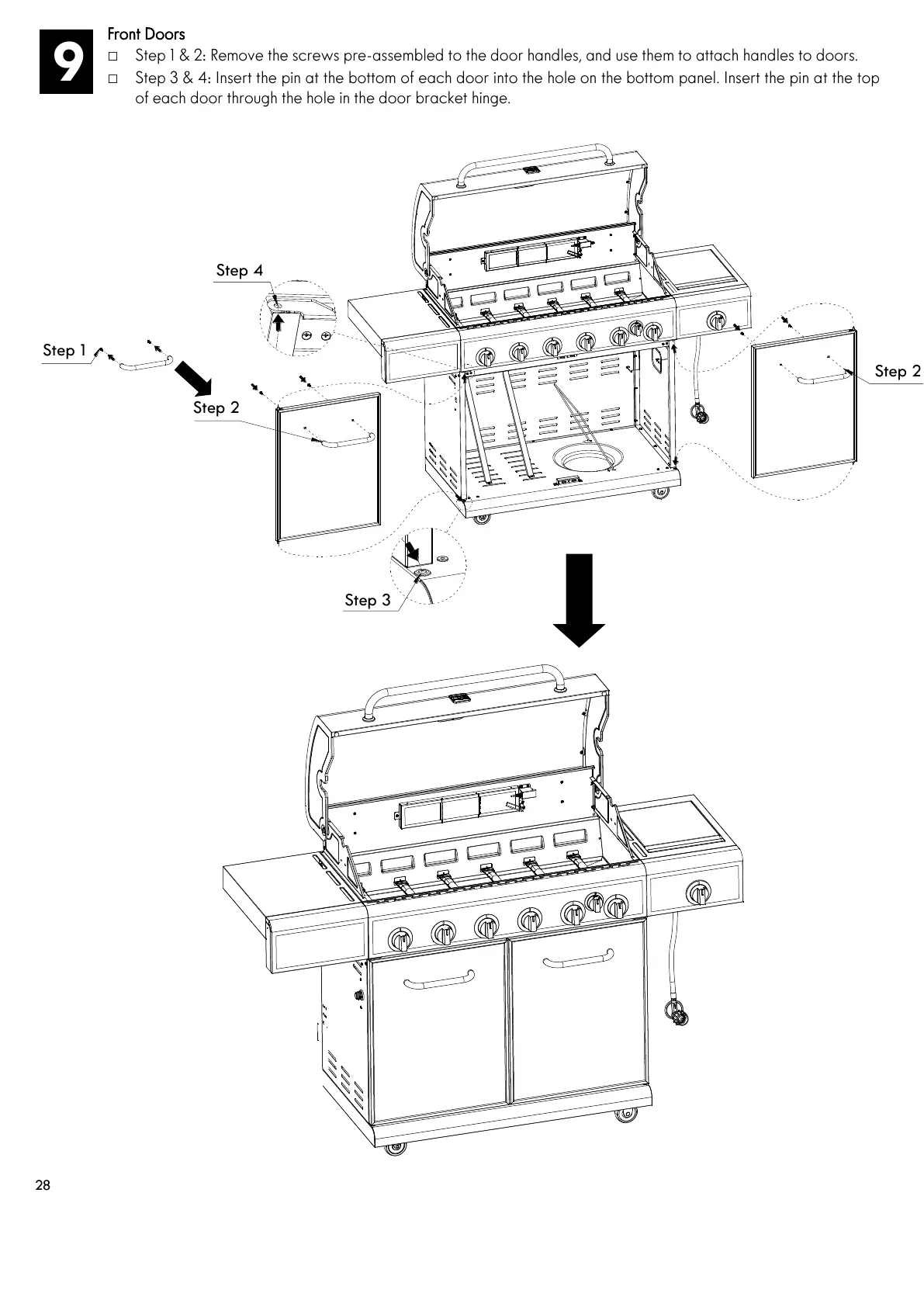 Step 1 & 2: Remove the screws pre-assembled to the door handles, and use them to attach handles to doors.