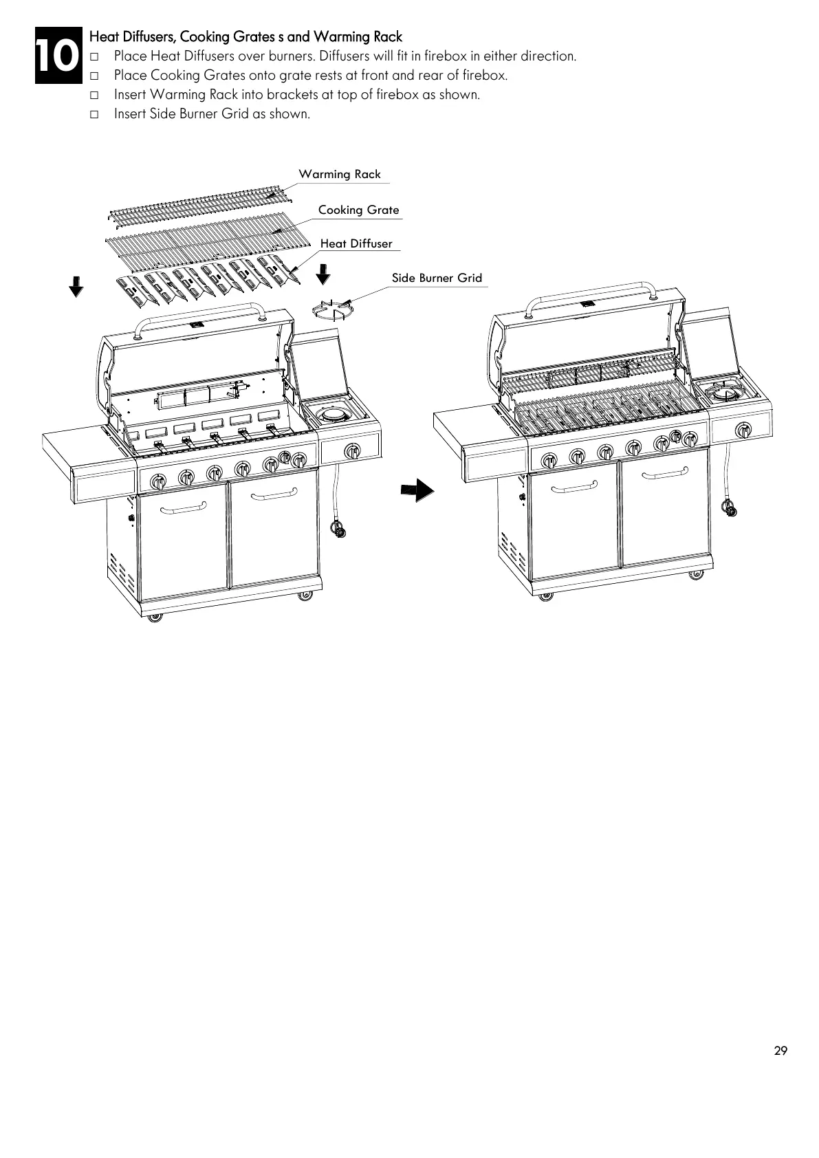 □ Place Heat Diffusers over burners. Diffusers will fit in firebox in either direction.