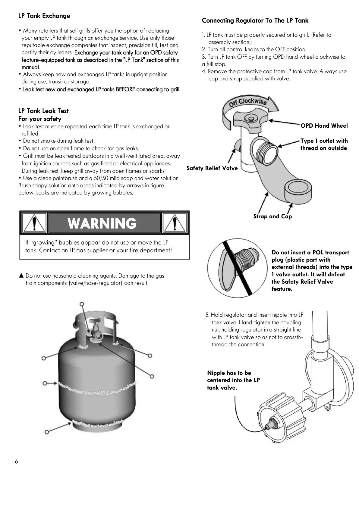 • Leak test new and exchanged LP tanks BEFORE connecting to grill.