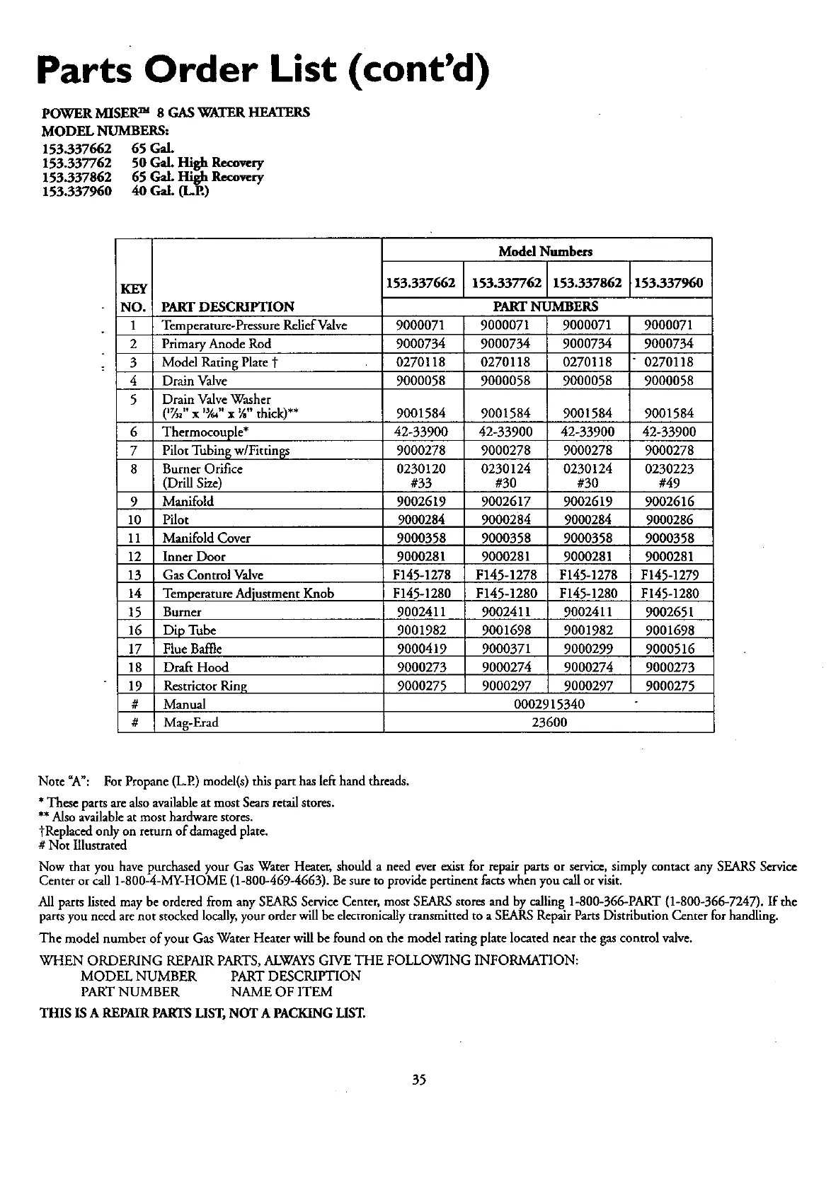 Now that you have purchased your Gas Water Heater, should a need ever exist for repair parts or service, simply contact any SEARS Service