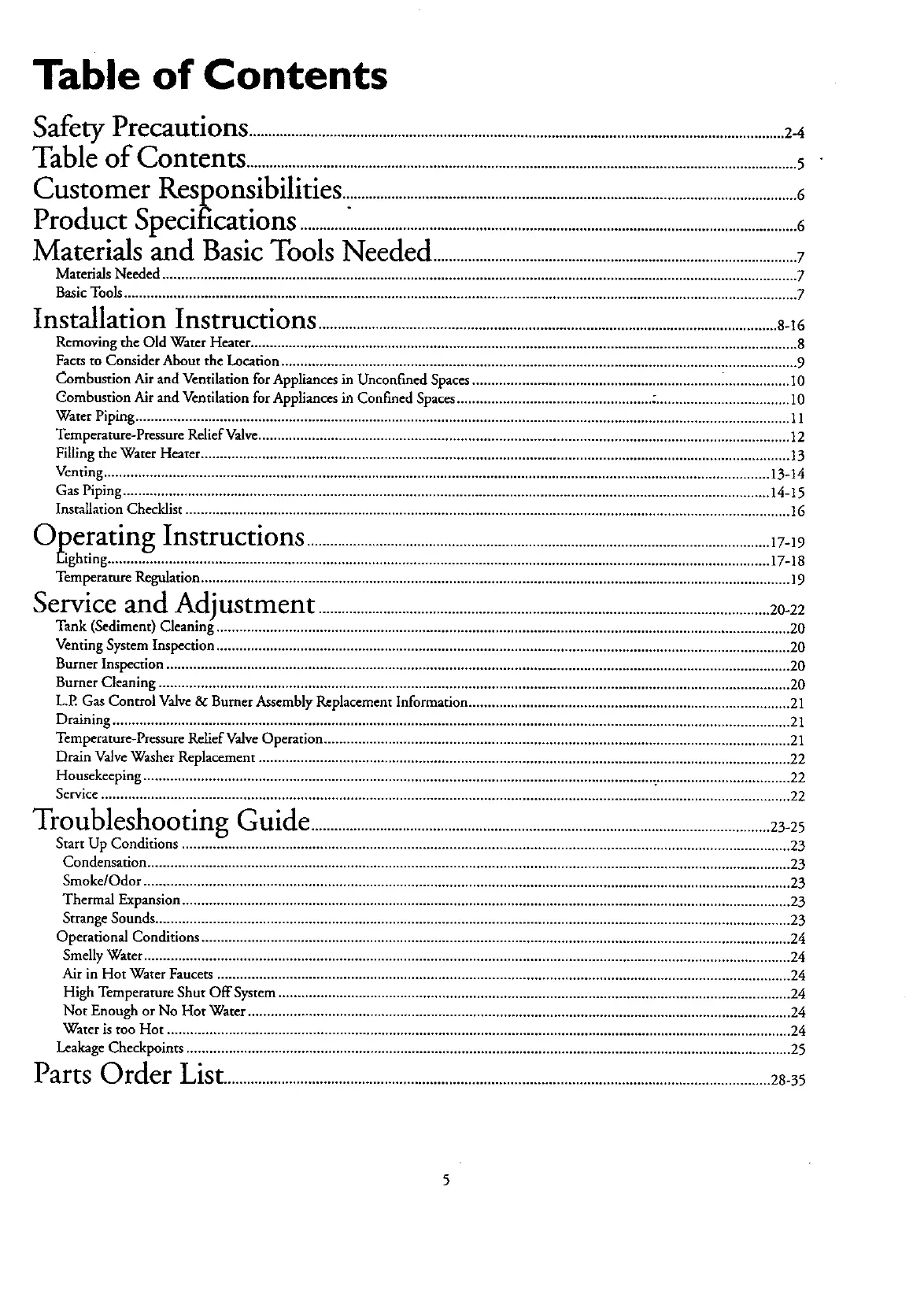 L.P. Gas Control Valve & Burner Assembly Replacement Information .................................................................................... 21
