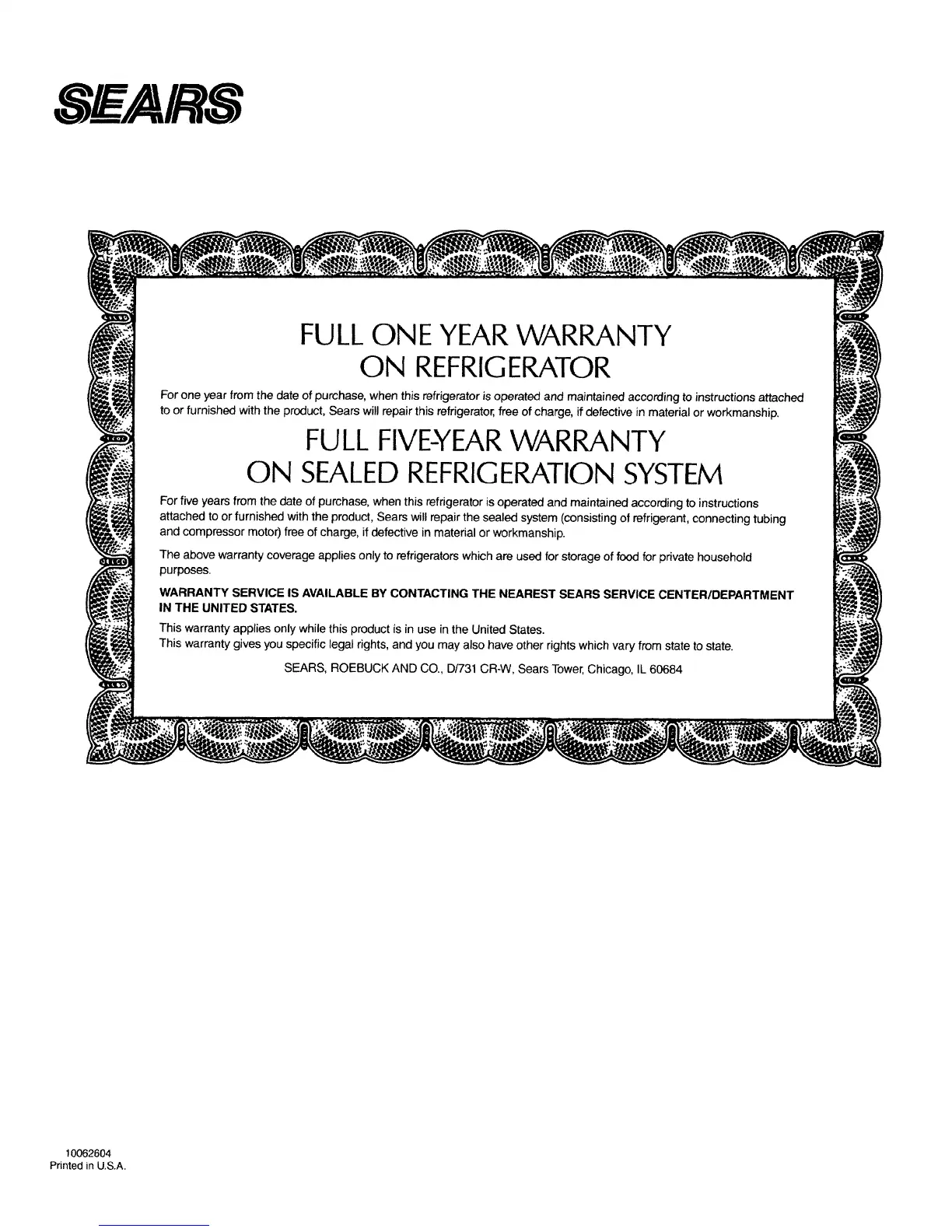 to or furnished with the product, Sears will repair this refrigerator, free of charge, if defective in material or workmanship,