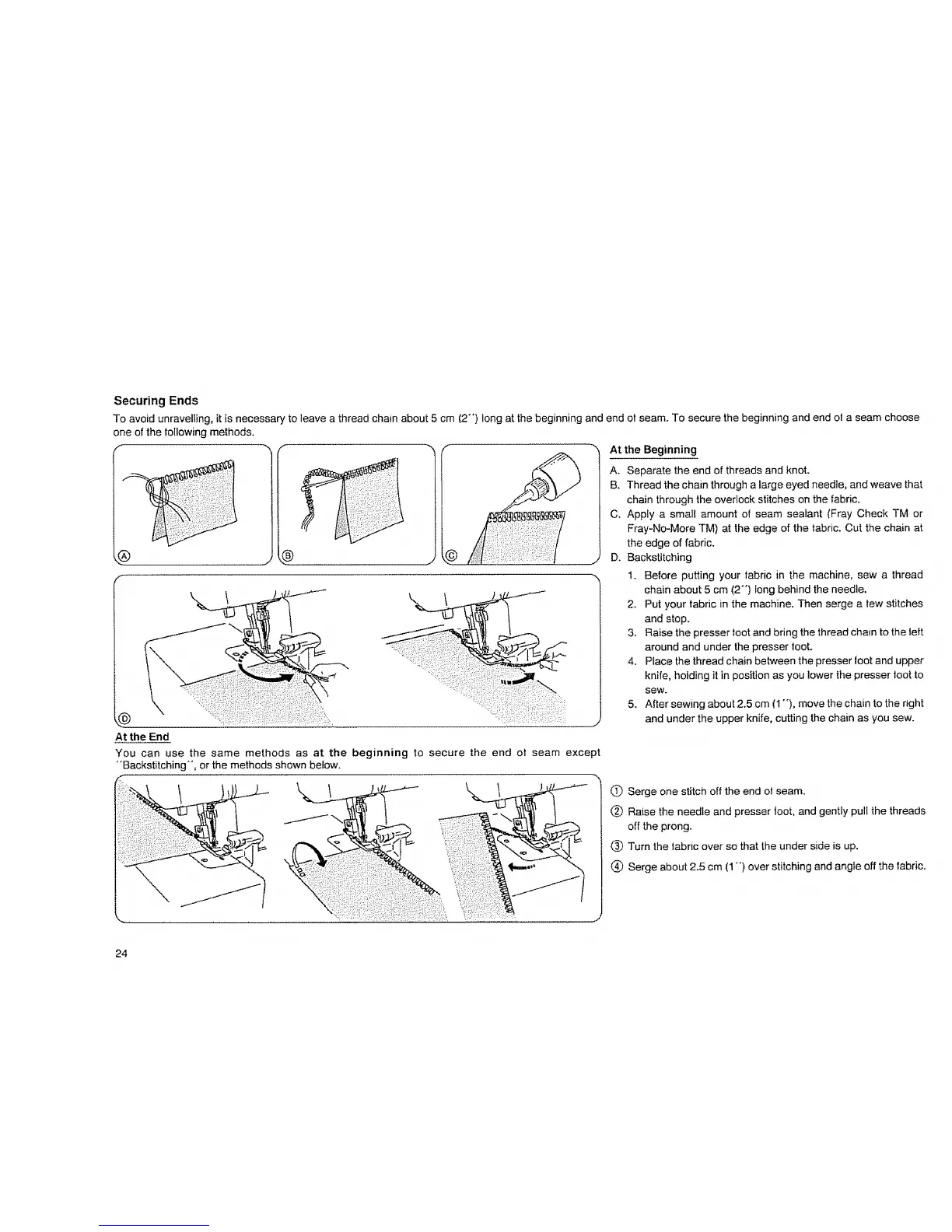 To avoid unravelling, itis necessaryto leave a thread chain about 5 cm (2°°)long at the beginning and end of seam. To secure the beginning and end of a seam choose