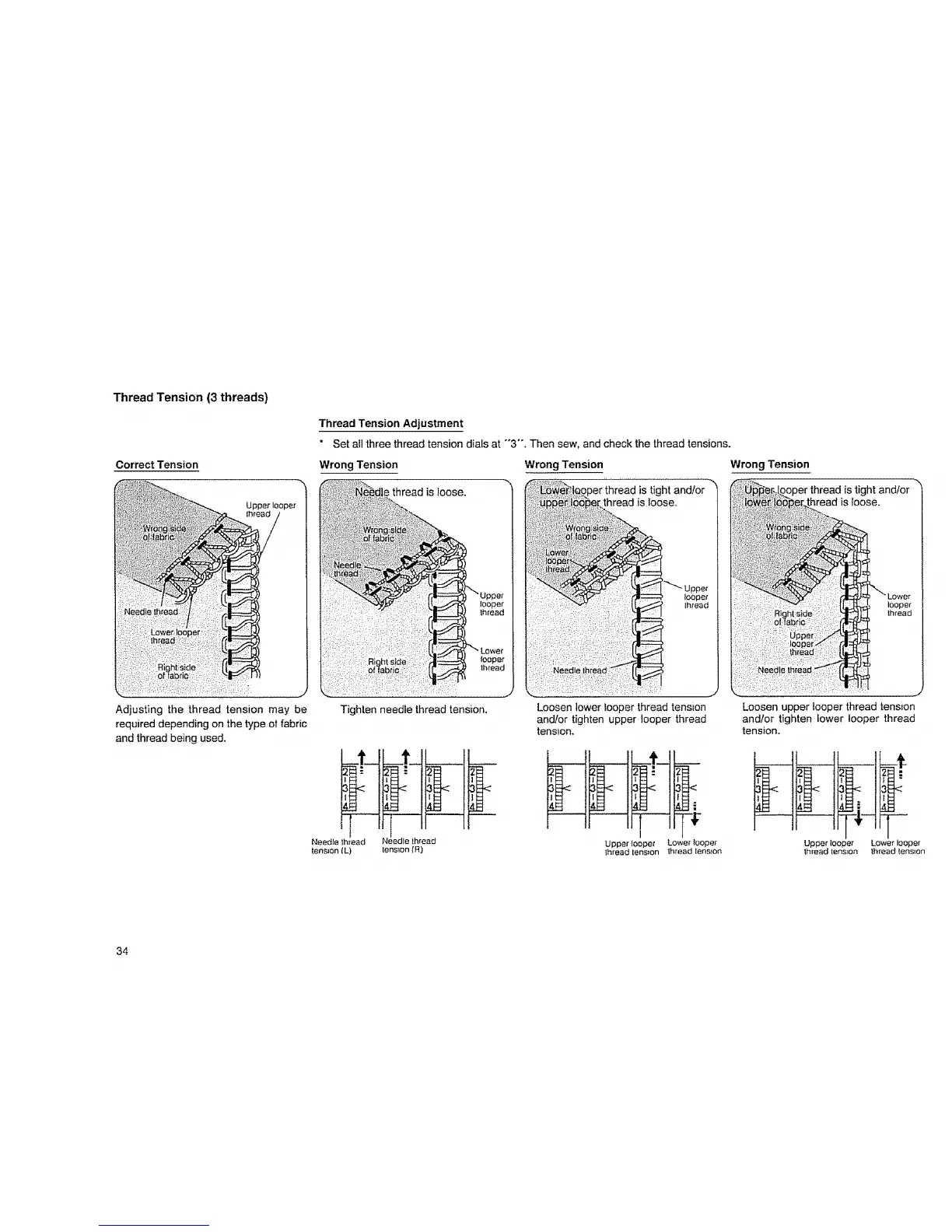 * Set all three thread tension dials at "'3"'. Then sew, and check the thread tensions,