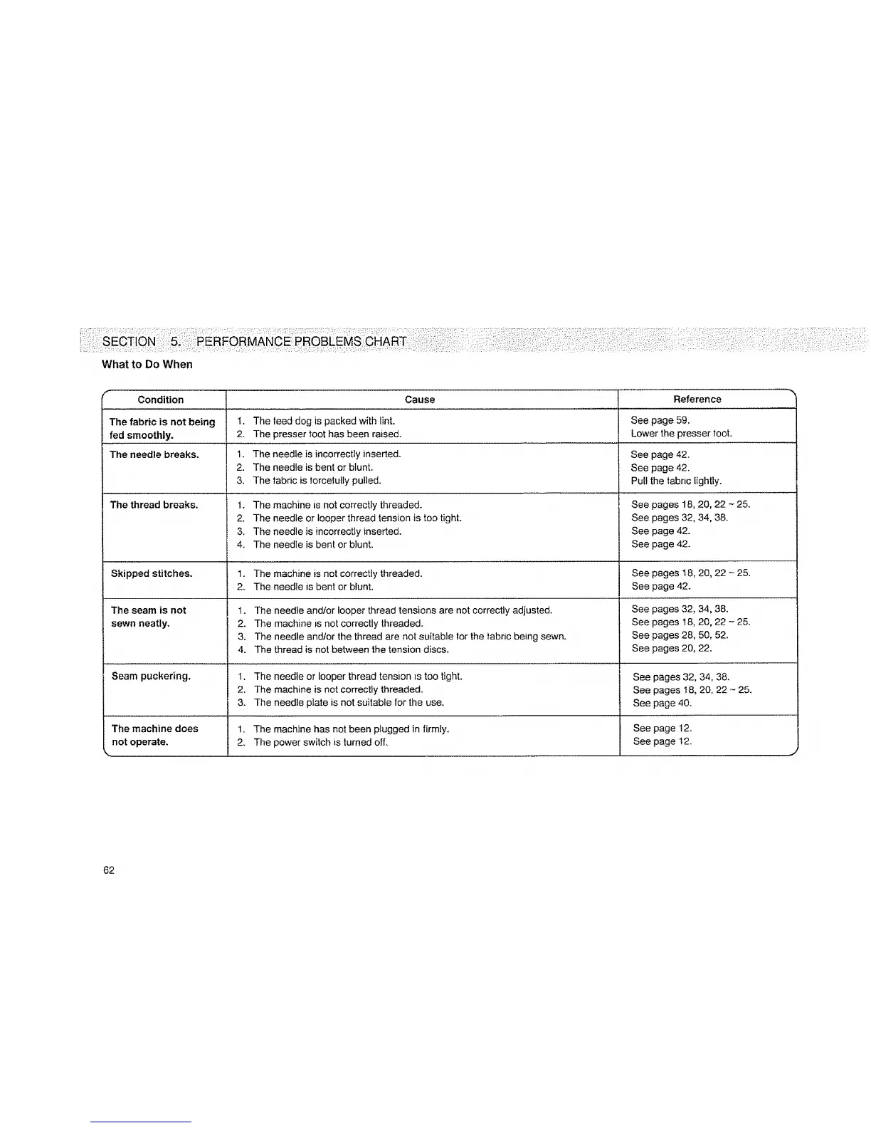 Seam puckering. 1. The needle or looper thread tension is too tight. See pages 32, 34, 38.