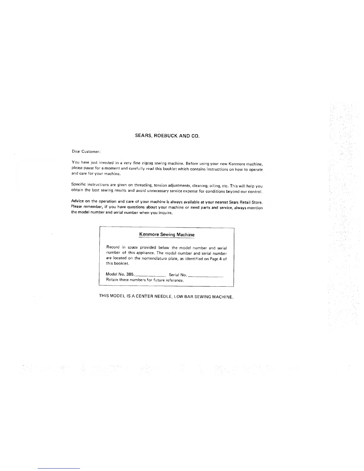 Advice on the operation and care of your machine is always available at your nearest Sears Retail Store.