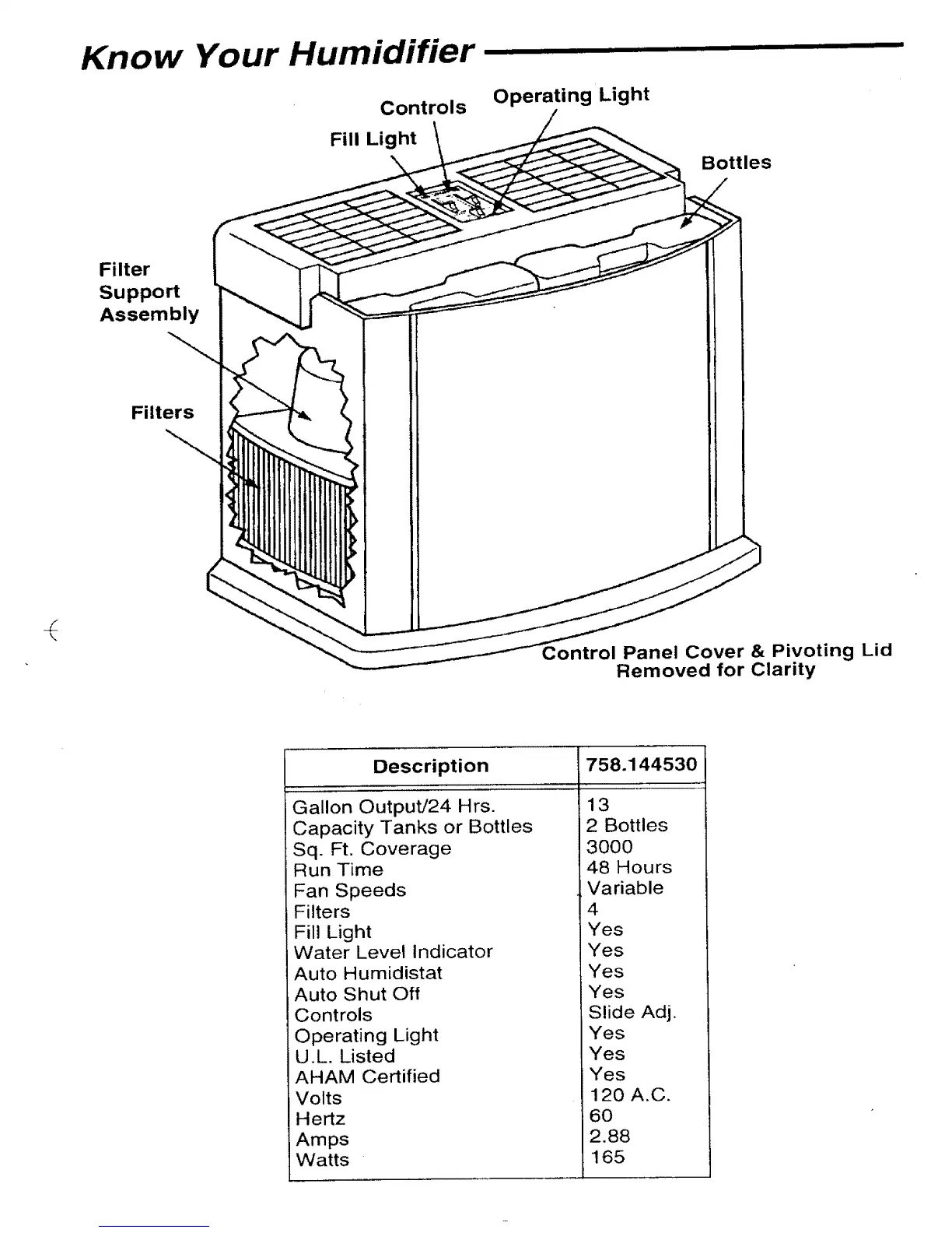 Kenmore Sears 758.144530 - Know Your Humidifier; Humidifier Components and Specifications