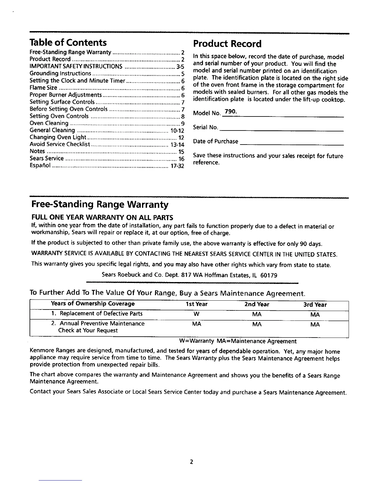 Free-Standing RangeWarranty ........................................ 2