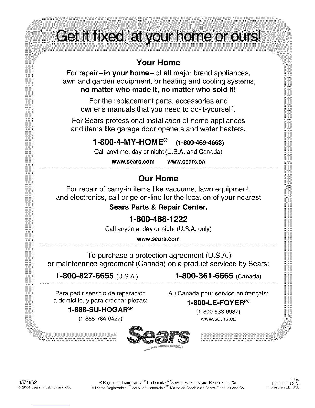 8571662 ® Registered Trademark / Trademark / Service Mark of Sears, Roebuck and Co, Printed in U.S.A,