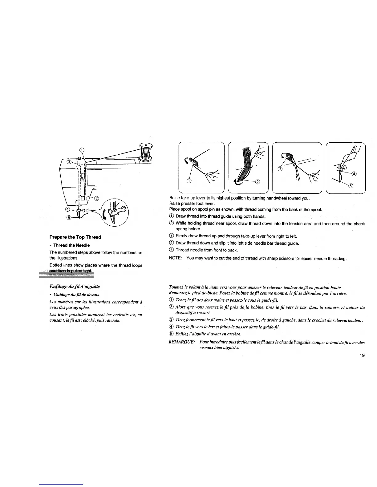 REMAR QUE: Pour introduire plusfacilement lefil dans le chas de l' aiguille, coupez lebout dufil avec des