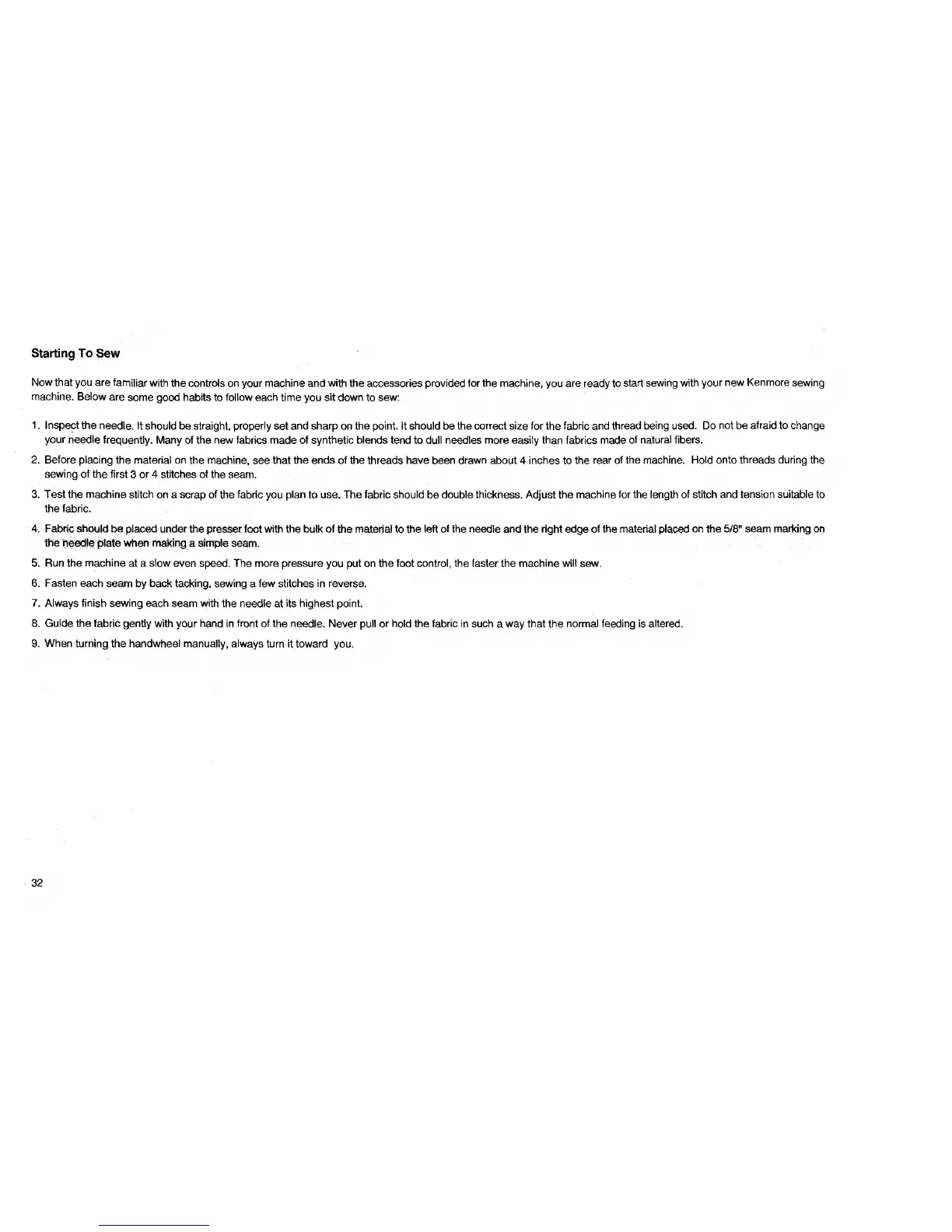 Now that you are familiar with the controls on your machine and with the accessories provided for the machine, you are ready to start sewing with your new Kenmore sewing