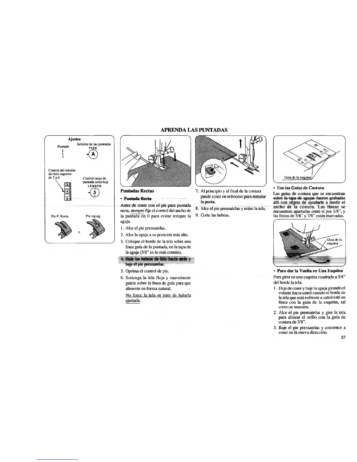 : " ................... _"- _'-- _...... 8_ Alce elpie prensatelasyretire la tela_ ancho de la costura. Las lineas se