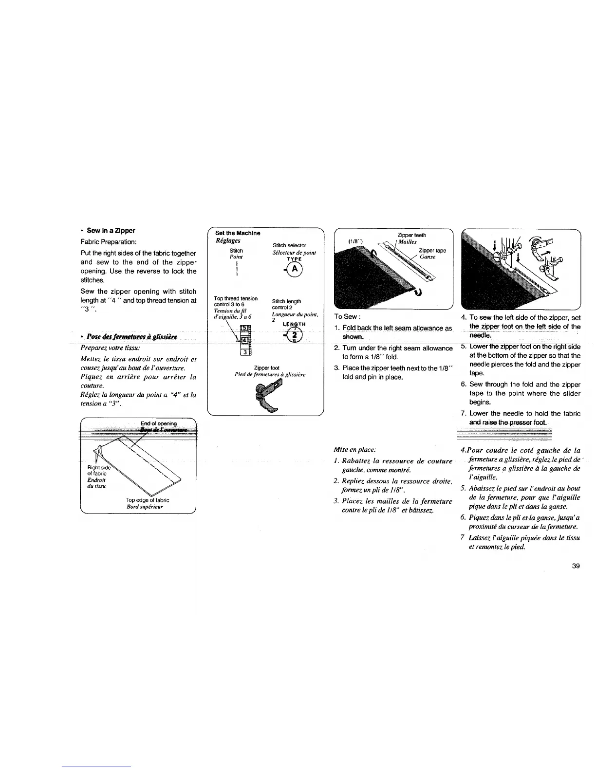 4. To sew the left side of the zipper, set