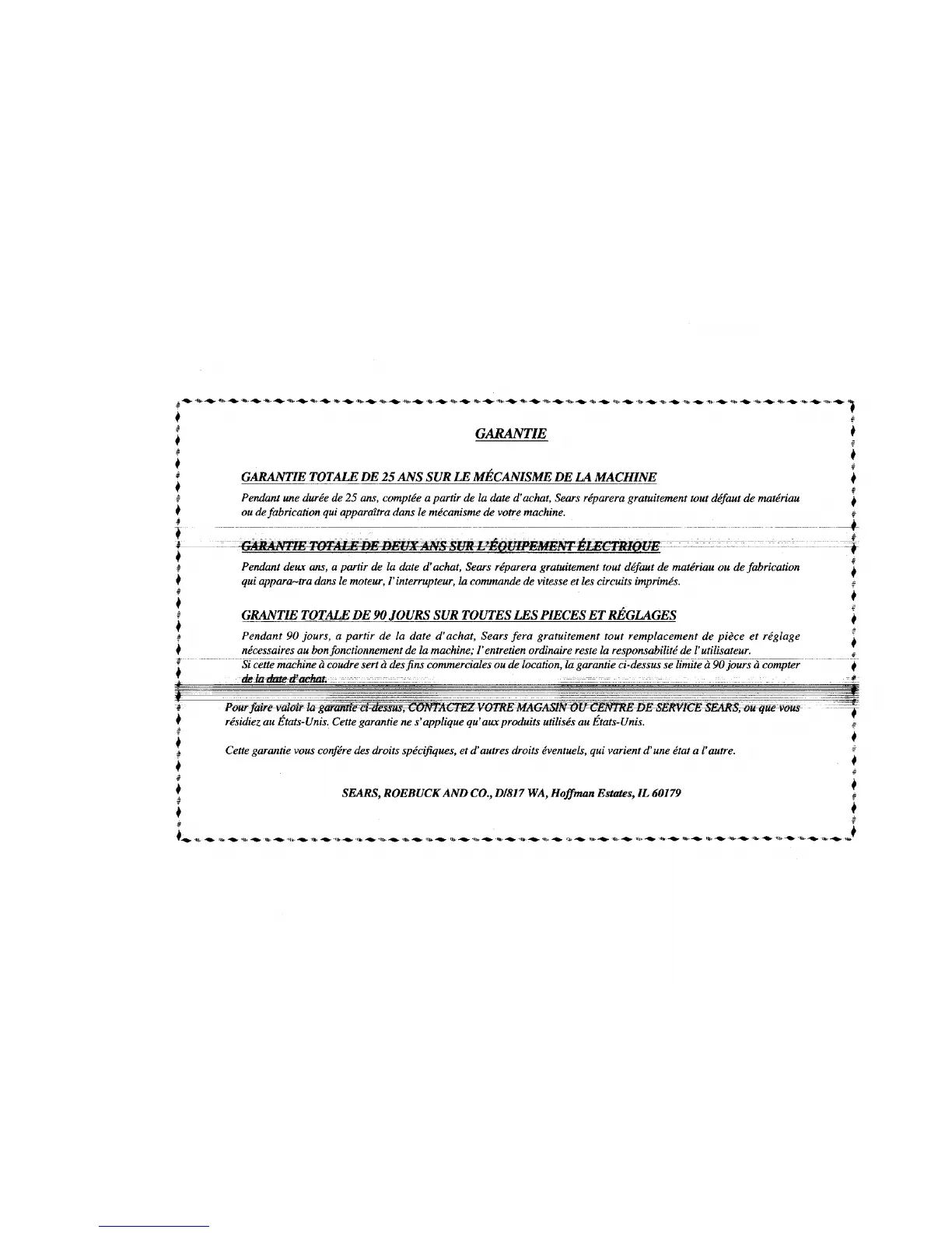 Pendant 90 jours, a partir de la date d"achat, Sears fera gratuitement tout remplacement de piece et rdglage