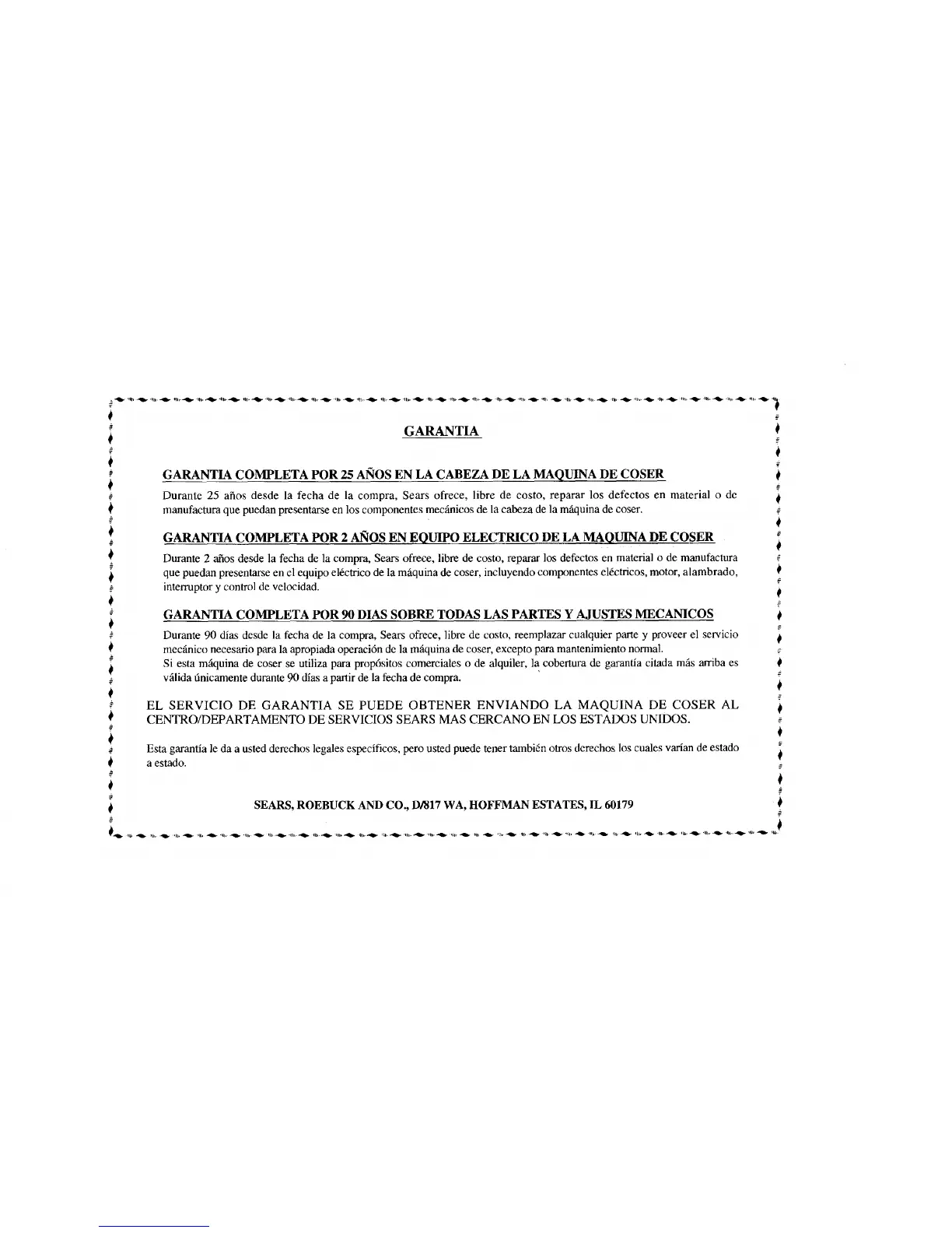 Durante 25 afios desde la fecha de la compra, Sears ofrcce, libre de costo, reparar los defectos en material o de