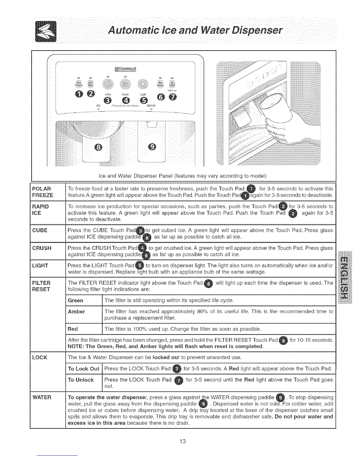 Press the UGHT Touch Pad@ to turn on dispenser light. The light also turns on automatically when ice and/or