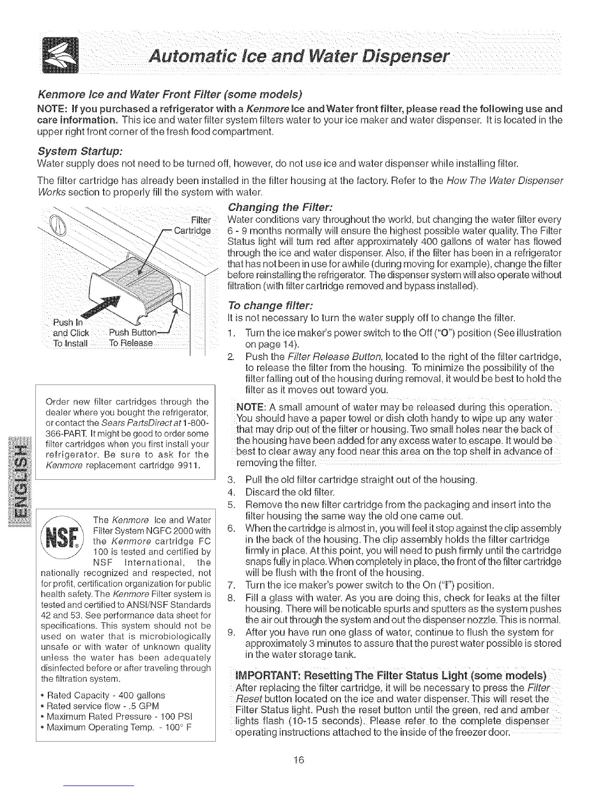 NOTE: If you purchased a refrigerator with a Kenmore ice and Water front filter, please read the following use and