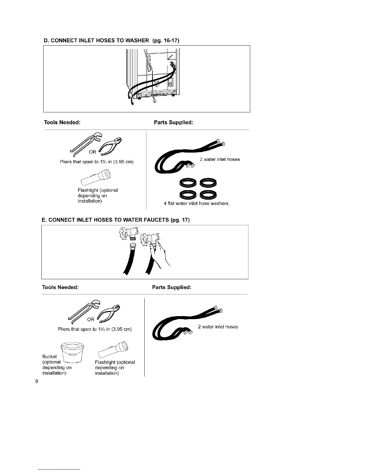 E. CONNECT INLET HOSES TO WATER FAUCETS (pg. 17)
