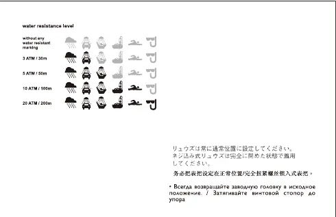 • When the watch is underwater or wet, never use the pushers/ bezels, or set the time. Watch cases and